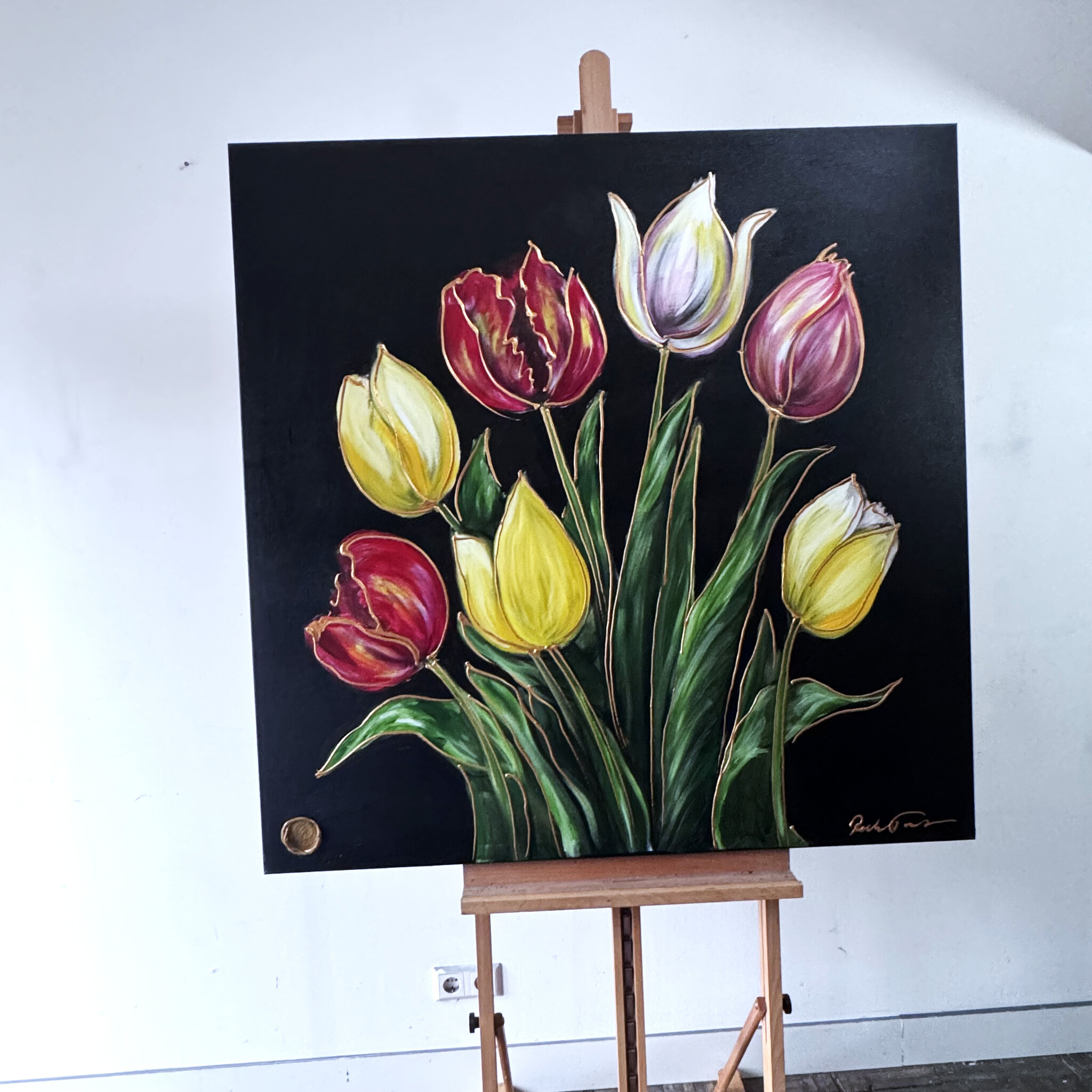 Painting- 120x120cm -Tulpenmanie - kleurrijke tulpen - Black & Gold #6