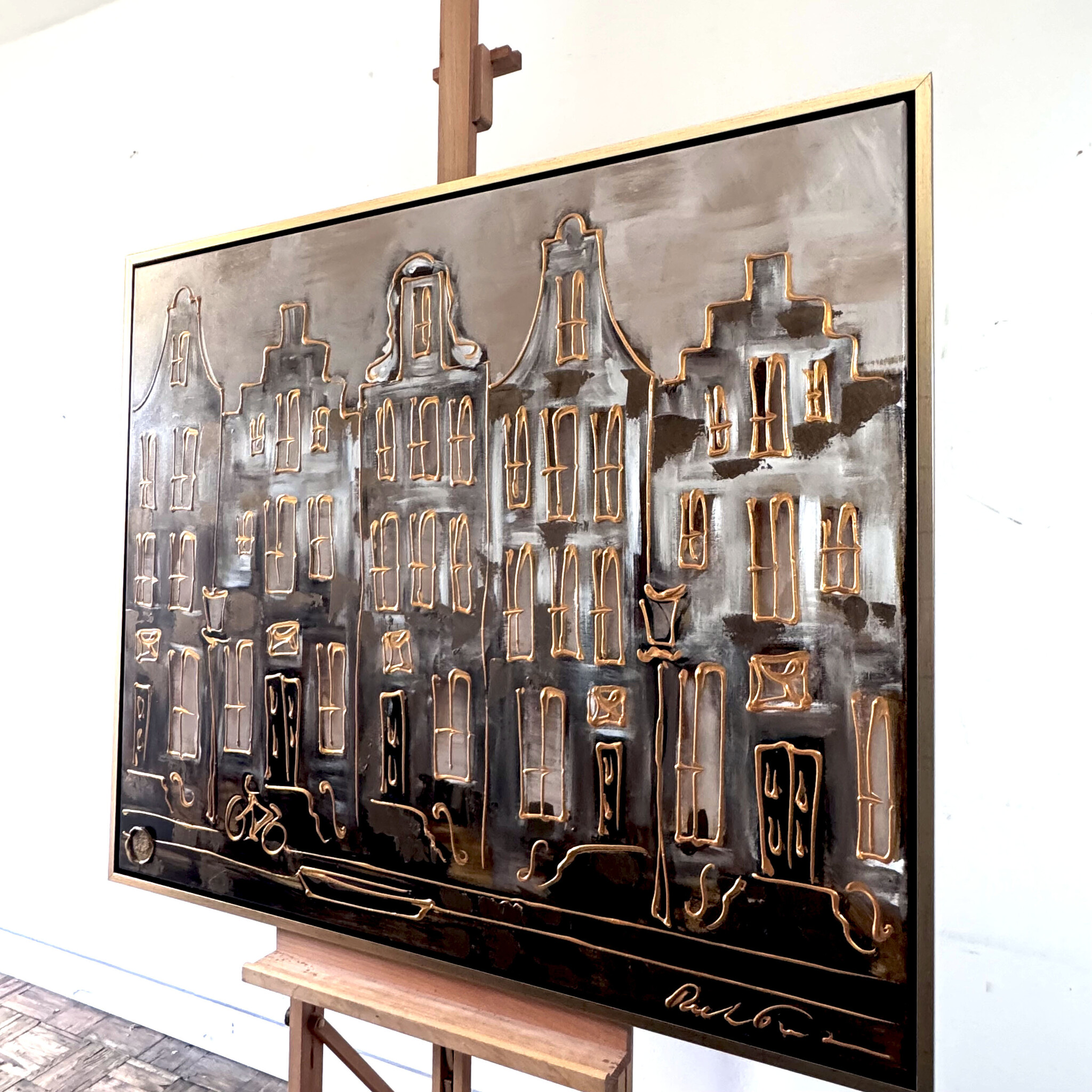 Rick builds his Amsterdam paintings from thick layers of paint and works with a clear handwriting that forms his signature. The thick golden line drawing that completes his work quickly reminds the viewer of Amsterdam in the golden age.