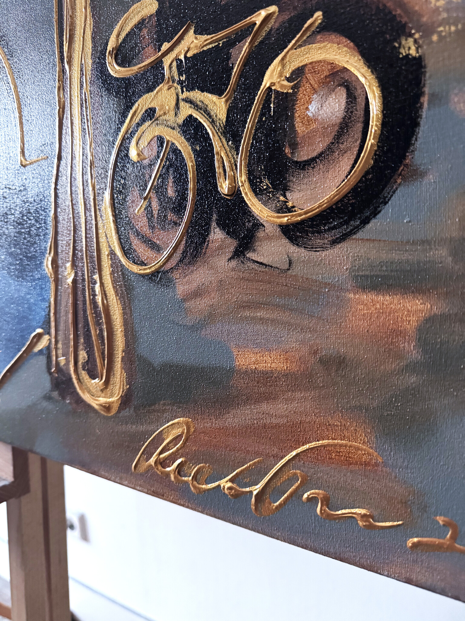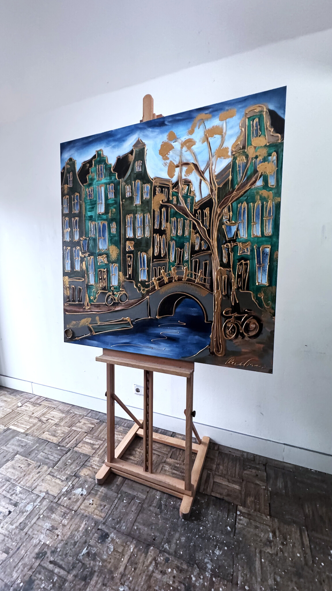 Rick builds his Amsterdam paintings from thick layers of paint and works with a clear handwriting that forms his signature. The thick golden line drawing that completes his work quickly reminds the viewer of Amsterdam in the golden age.