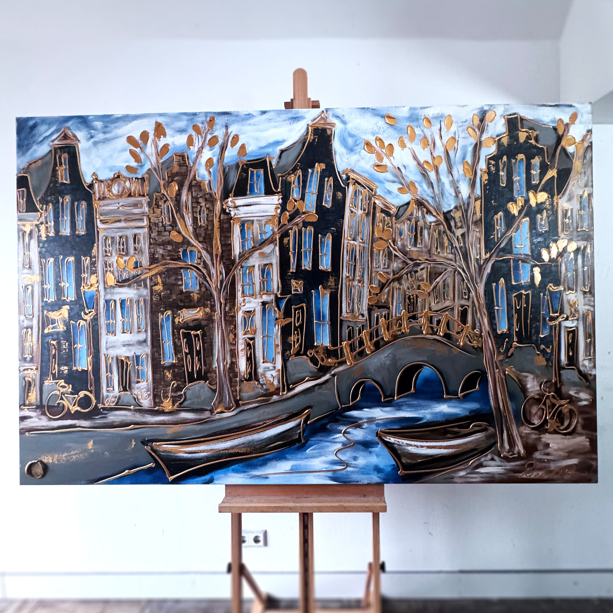 Rick builds his Amsterdam paintings from thick layers of paint and works with a clear handwriting that forms his signature. The thick golden line drawing with which his work is completed quickly reminds the viewer of Amsterdam in the golden age.