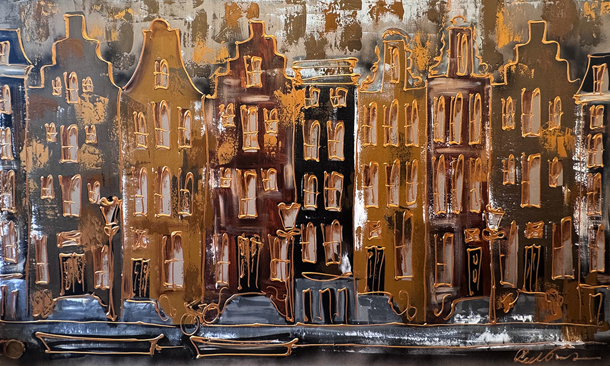 Rick builds his Amsterdam paintings from thick layers of paint and works with a clear handwriting that forms his signature. The thick golden line drawing with which his work is completed quickly reminds the viewer of Amsterdam in the golden age.