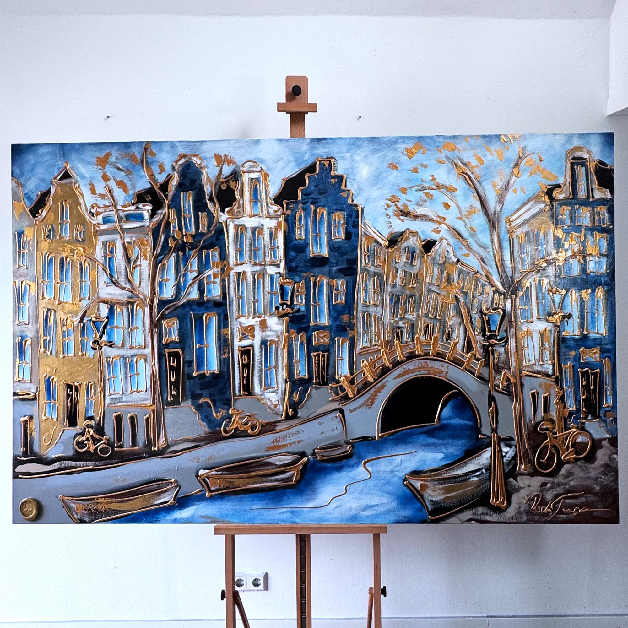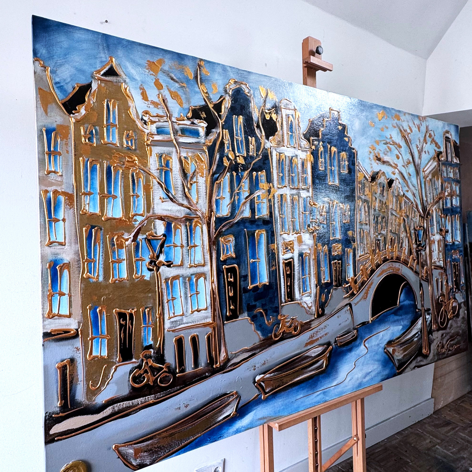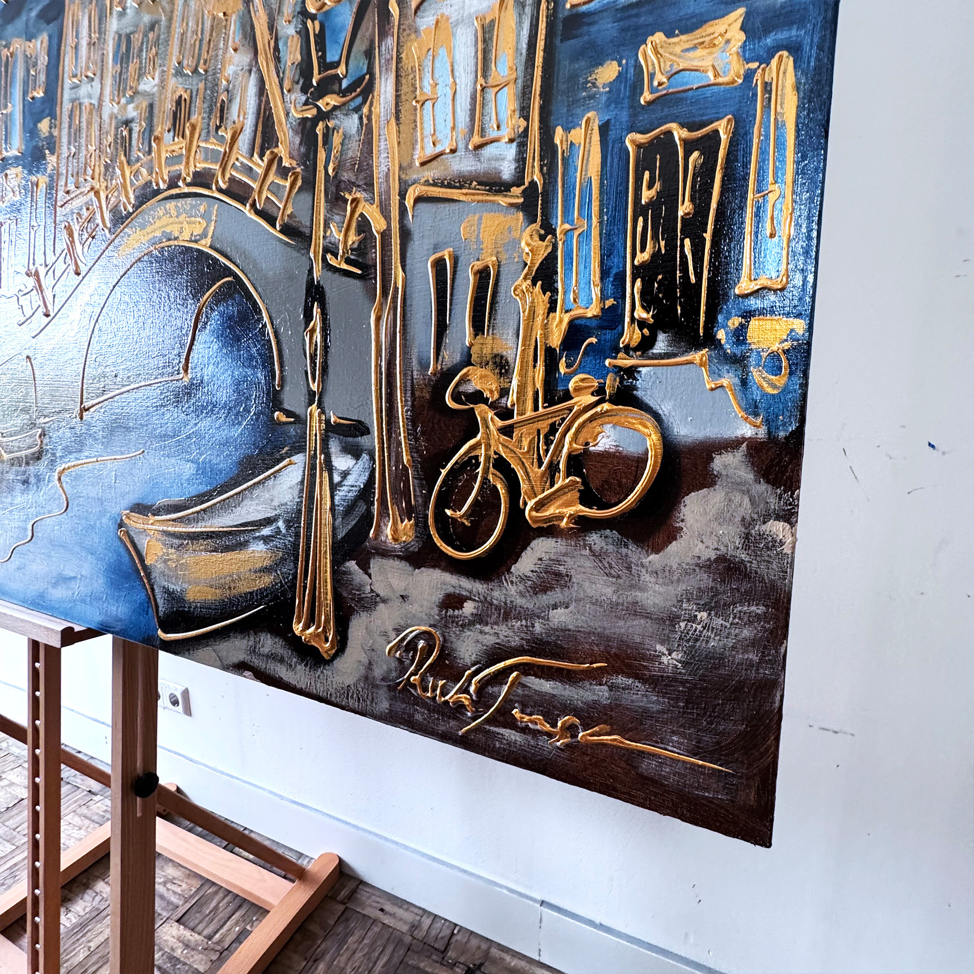 Rick builds his Amsterdam paintings from thick layers of paint and works with a clear handwriting that forms his signature. The thick golden line drawing with which his work is completed quickly reminds the viewer of Amsterdam in the golden age.