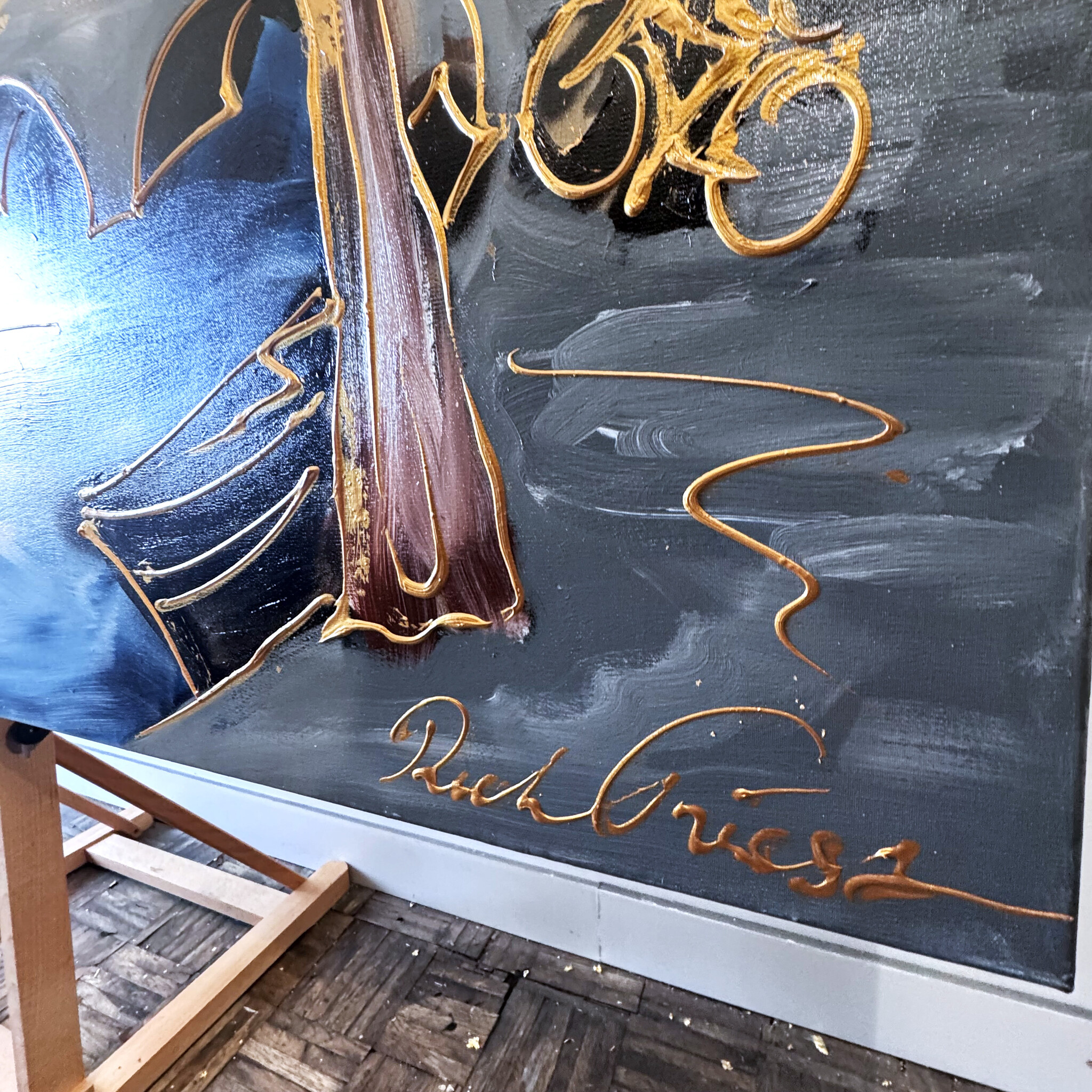 Rick builds his Amsterdam paintings from thick layers of paint and works with a clear handwriting that forms his signature. The thick golden line drawing that completes his work quickly reminds the viewer of Amsterdam in the golden age.