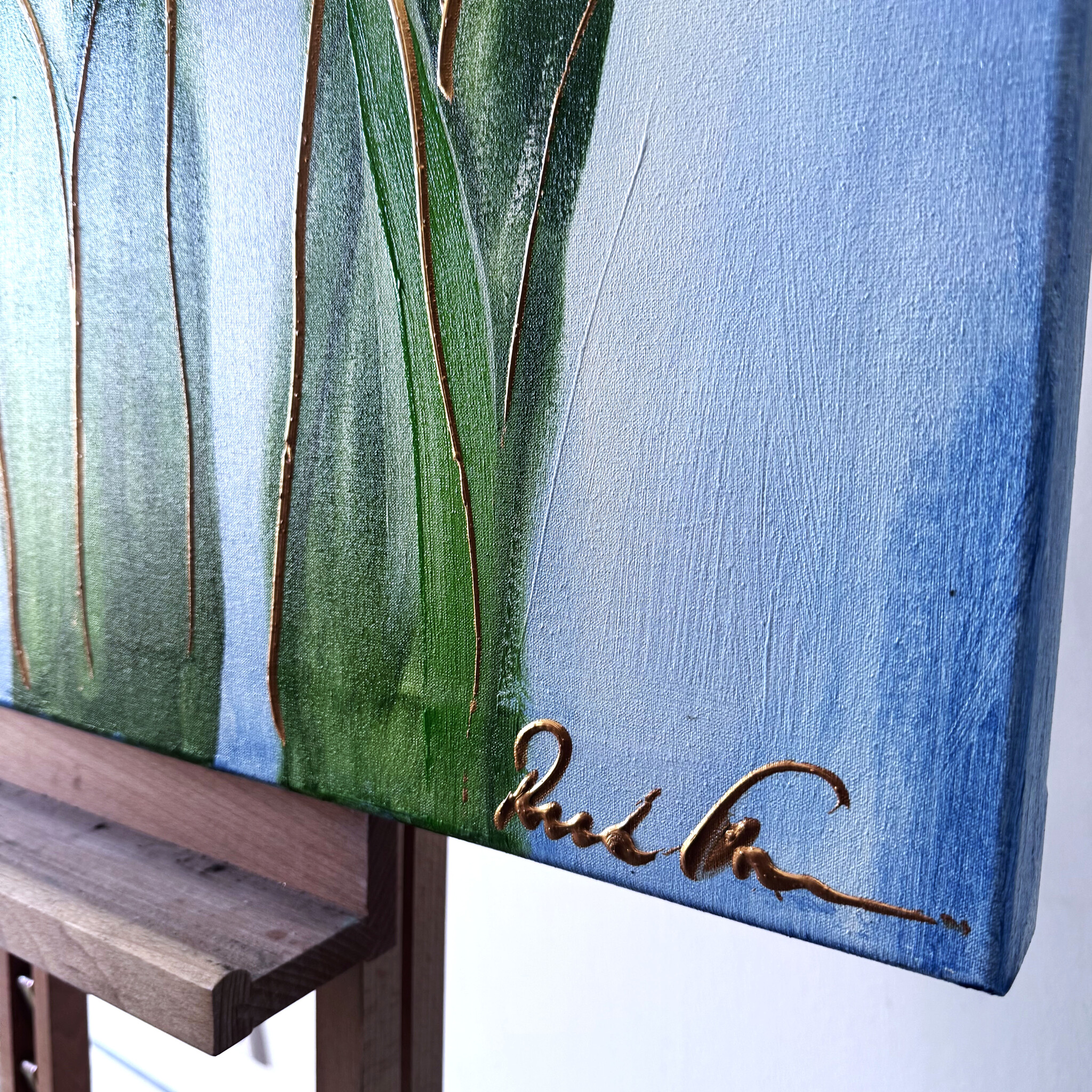 Rick builds the tulip paintings from thick layers of paint and works with a clear handwriting that forms his signature. The thick golden line drawing that completes his work quickly reminds the viewer of Amsterdam & the Netherlands in the golden age.