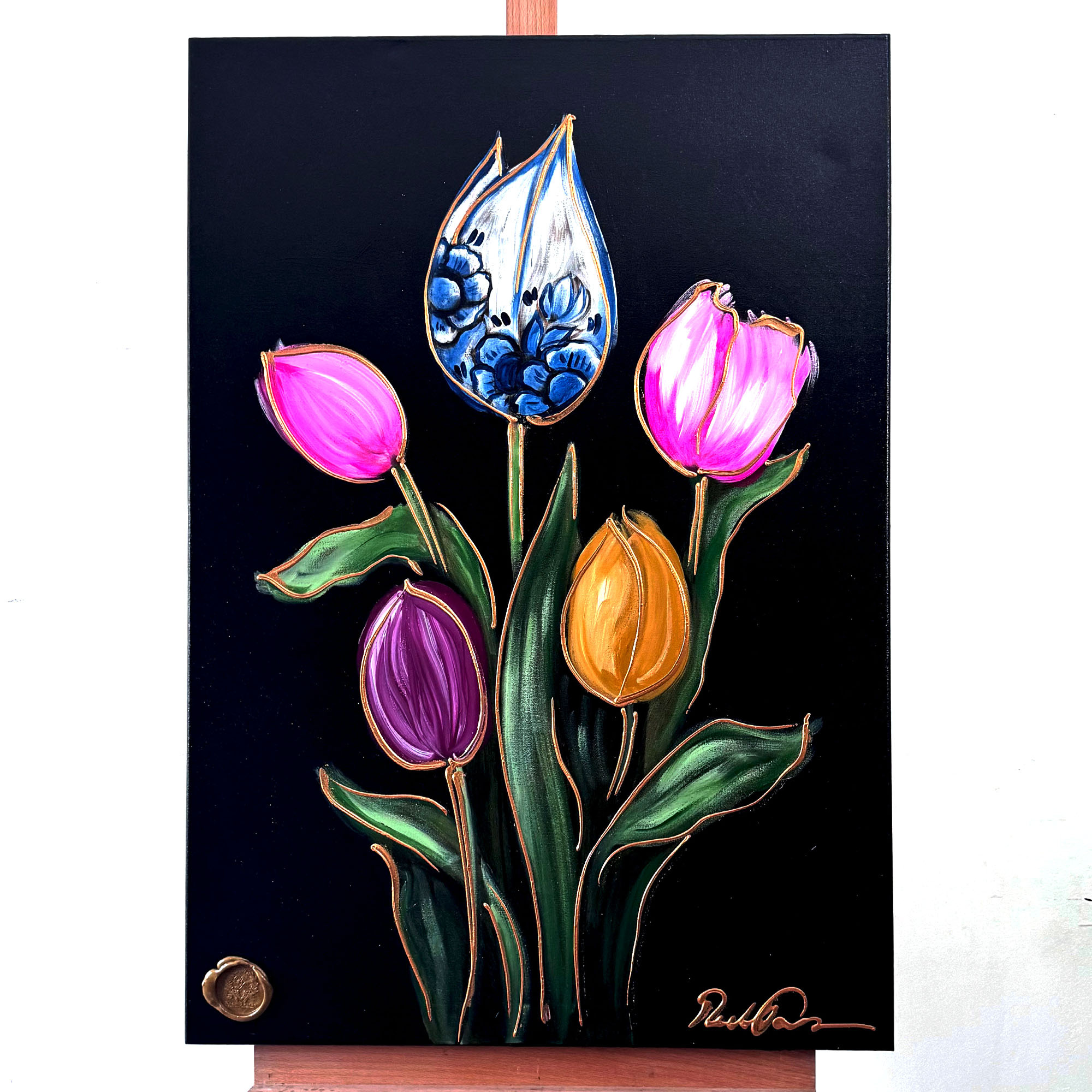 • Painting  - 70x100 cm - Rick Triest -  kleurrijke tulpen - Black & Gold #3