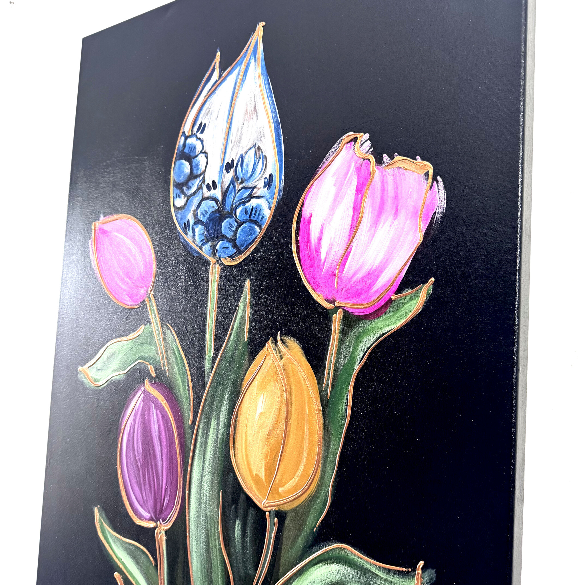 Painting  - 70x100 cm - Rick Triest -  kleurrijke tulpen - Black & Gold #3