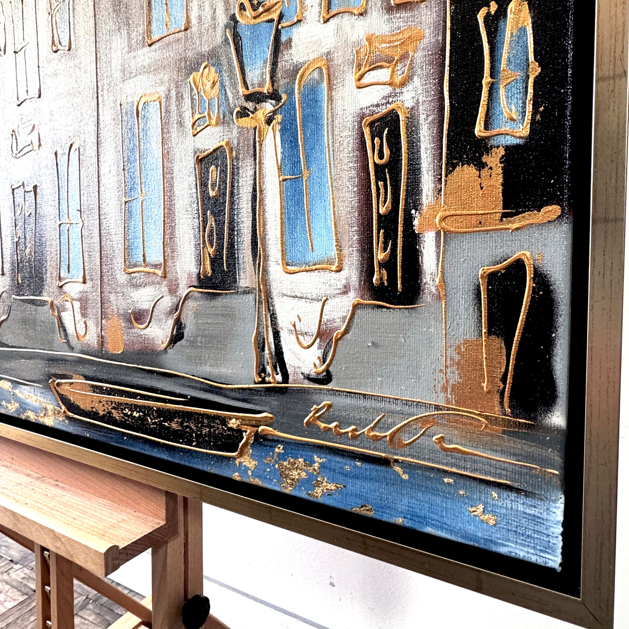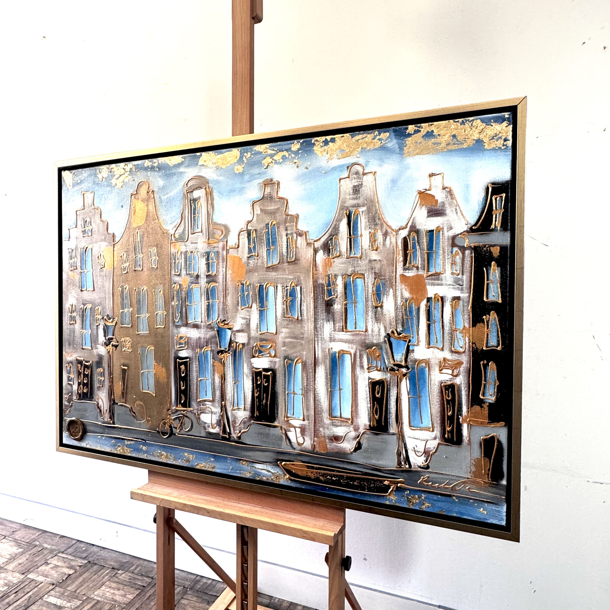 Rick builds his Amsterdam paintings from thick layers of paint and works with a clear handwriting that forms his signature. The thick golden line drawing that completes his work quickly reminds the viewer of Amsterdam in the golden age.