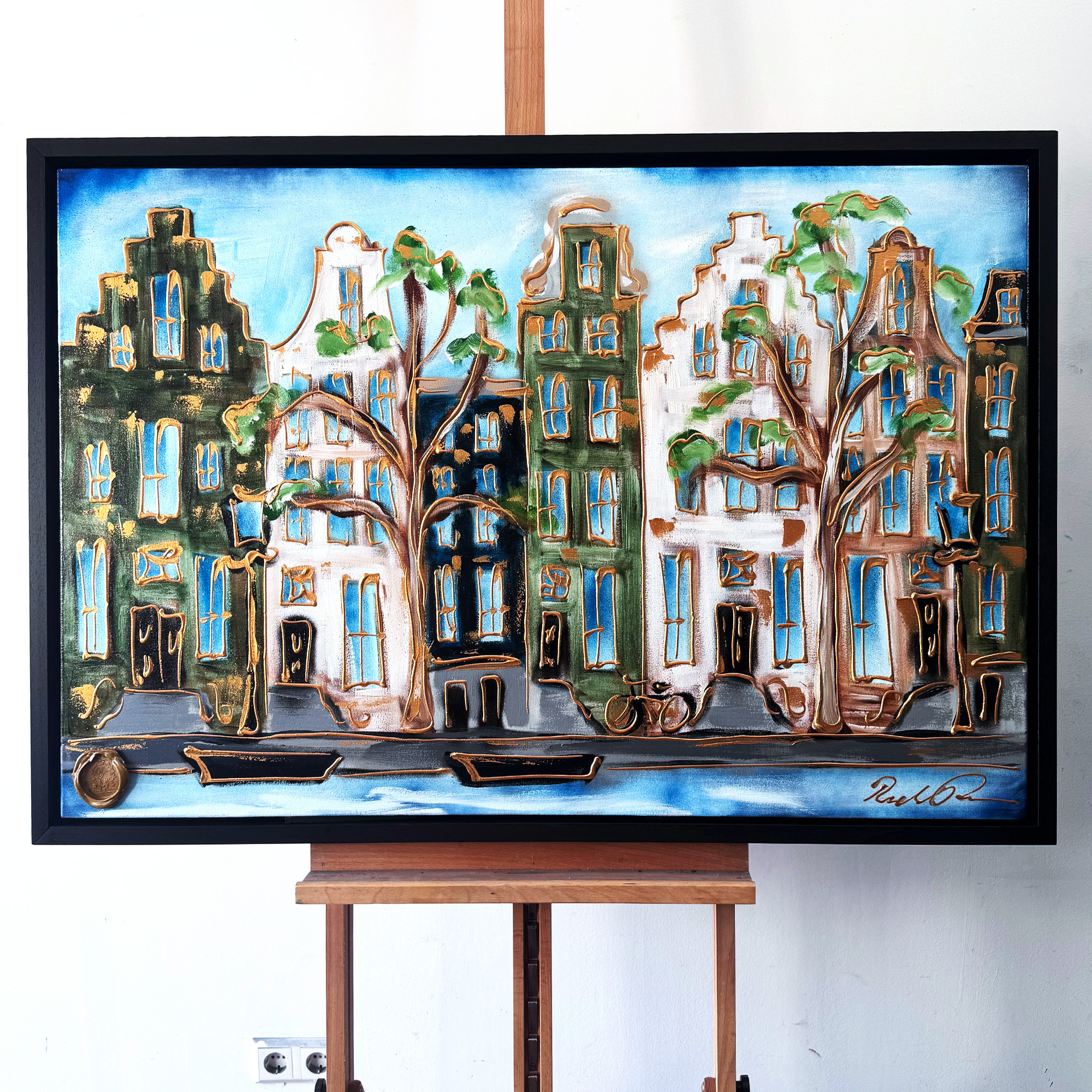 Artist Note: My works in the Amsterdam series are made in several layers of acrylic paint, inspired by Rembrandt's glazing technique. Also visible is the frottis technique of the dry brush in combination with oil pastels from Sennelier (known from Picasso) purchased in Paris. The free drawing style, which I create with charcoal, is also very characteristic. Each layer of the work is exposed through these mixed techniques.