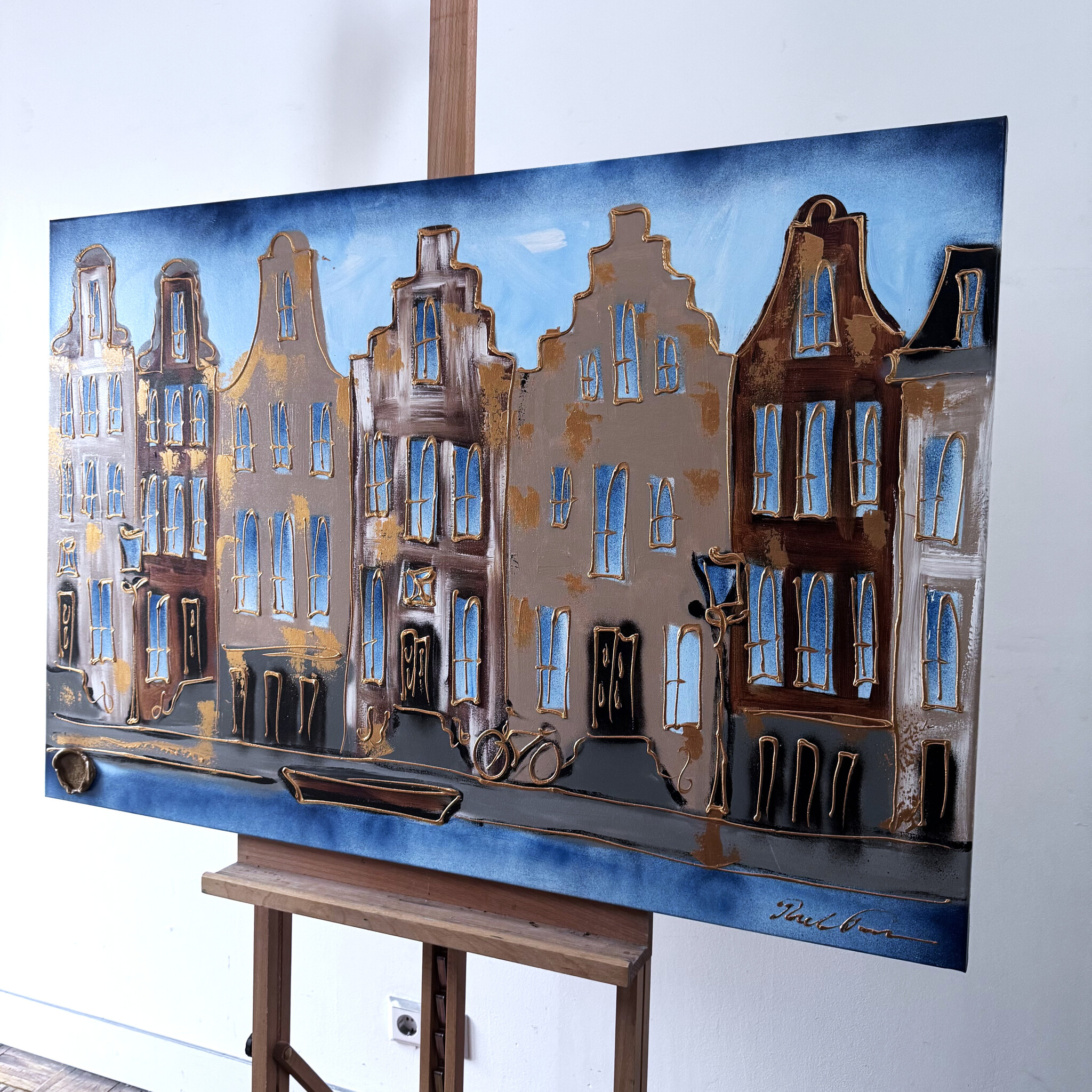 Rick builds his Amsterdam paintings from thick layers of paint and works with a clear handwriting that forms his signature. The thick golden line drawing that completes his work quickly reminds the viewer of Amsterdam in the golden age.