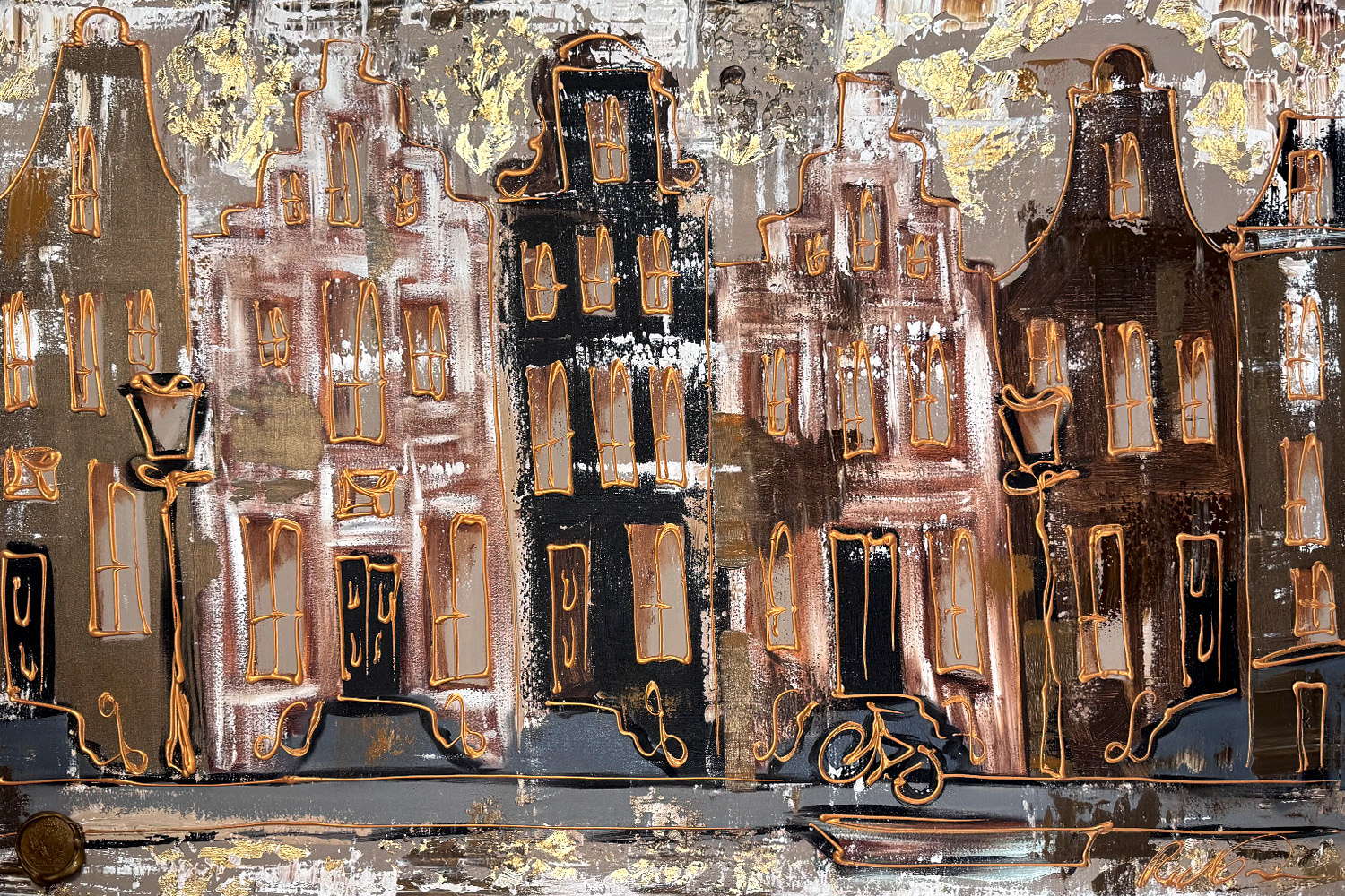 Painting- 80x120x4,5 cm - Amsterdam LUXURY style - grachten gevels in omber & Gold #2323