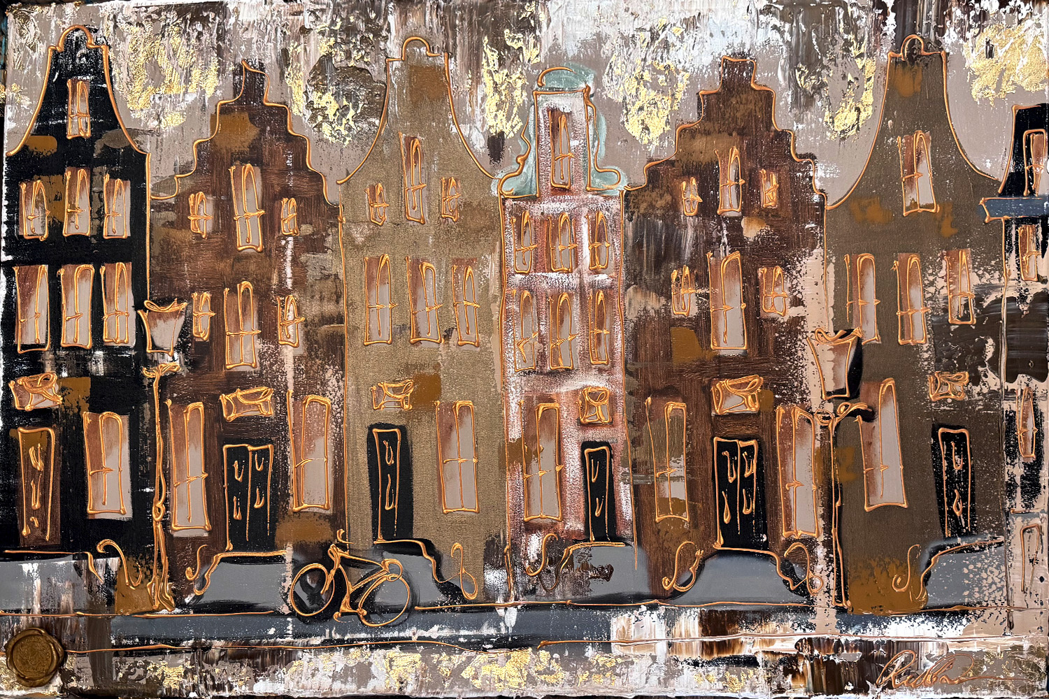 Painting- 80x120x4,5 cm - Amsterdam LUXURY style - grachten gevels in omber & Gold #231
