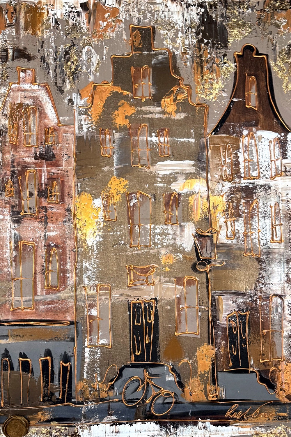 Painting- 80x120x4,5 cm - Amsterdam LUXURY style - grachten gevels in omber & Gold #2323