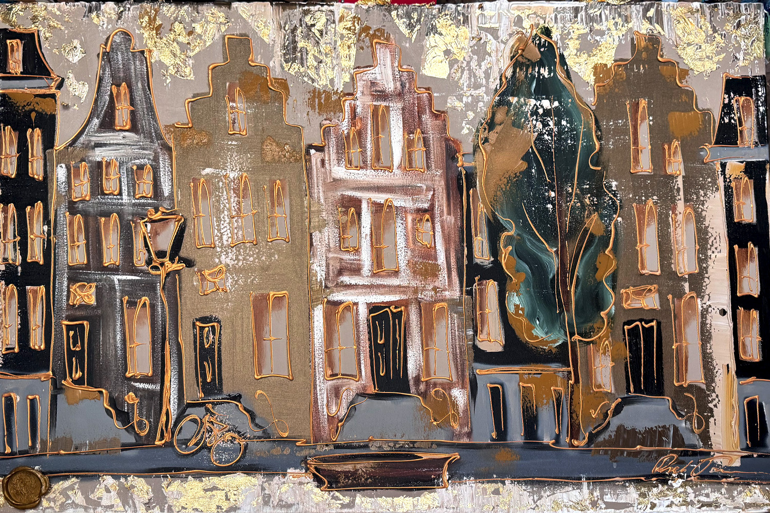Rick builds his Amsterdam paintings from thick layers of paint and works with a clear handwriting that forms his signature. The thick golden line drawing that completes his work quickly reminds the viewer of Amsterdam in the golden age.