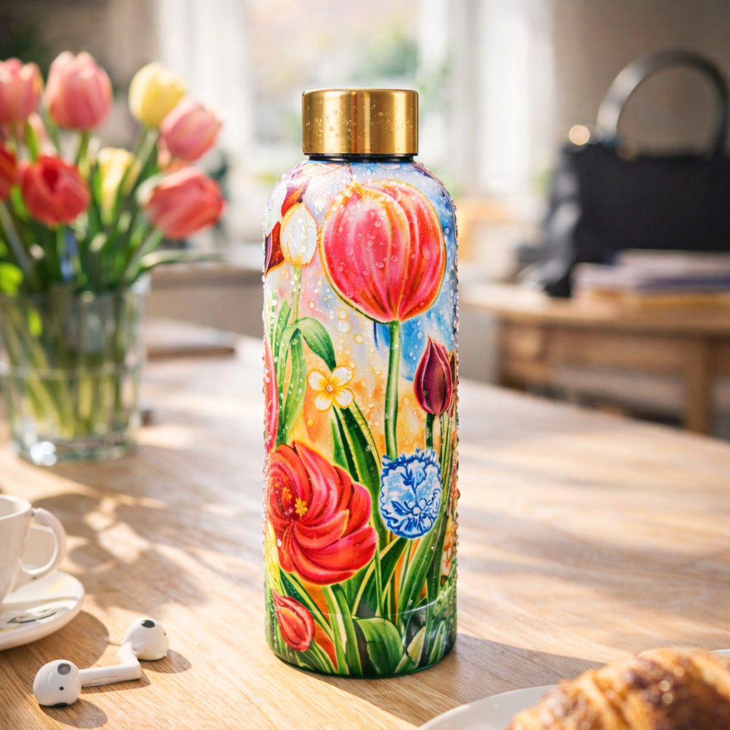 Tulpen zijn iconisch voor Nederland. Niet voor niets hebben wij deze prachtige serie de naam Dutch Beauty gegeven.Kunstenaar Rick Triest laat zich inspireren door de Gouden Eeuw, een tijd waarin de tulp immens populair was en werd gezien als een waardevol bezit. Dit gevoel van exclusiviteit en luxe sluit naadloos aan bij de verfijnde uitstraling van Designed by Rick Triest. Daarnaast draagt de Dutch Beauty bij aan het culturele aspect van de collectie. De pracht van Holland komt in alle producten naar voren. Producten die u in deze lijn kunt tegenkomen zijn tassen, sleutelhangers, mokken, onderzetters, waterflessen en meer!