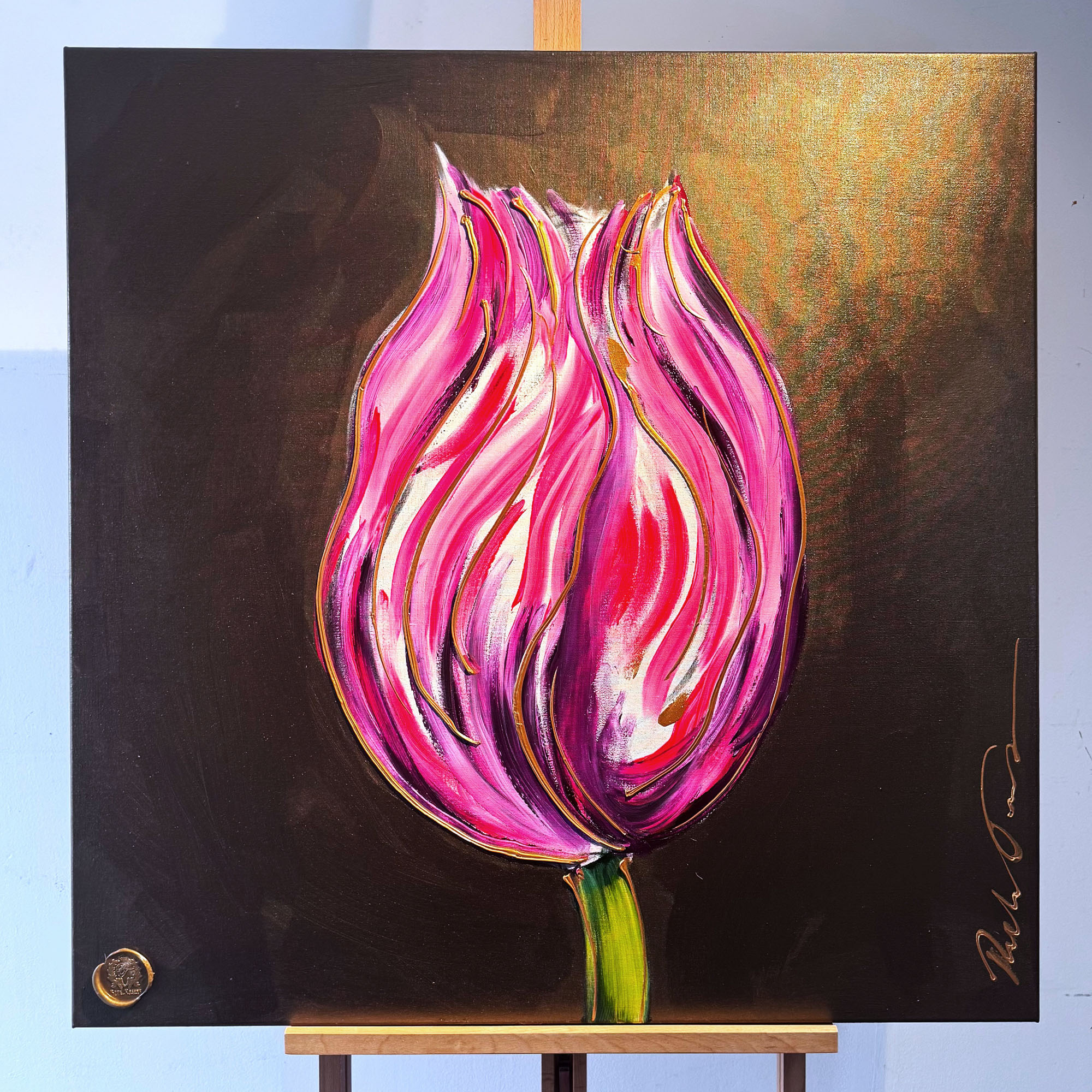 Artist Note: Mijn werken in de Serie Tulp Mania, zijn gemaakt in diverse lagen acryl verf, geïnspireerd op de glacis techniek van Rembrandt. Ook zo zichtbaar is de frottis techniek van de droge kwast in combinatie met in Parijs gekocht oliepastels van Sennelier. Ook is de vrije tekenstijl van de tulpen, die ik opzet met houtskool, zeer kenmerkend. Elke laag van het werk ligt bloot door deze gemengde technieken.