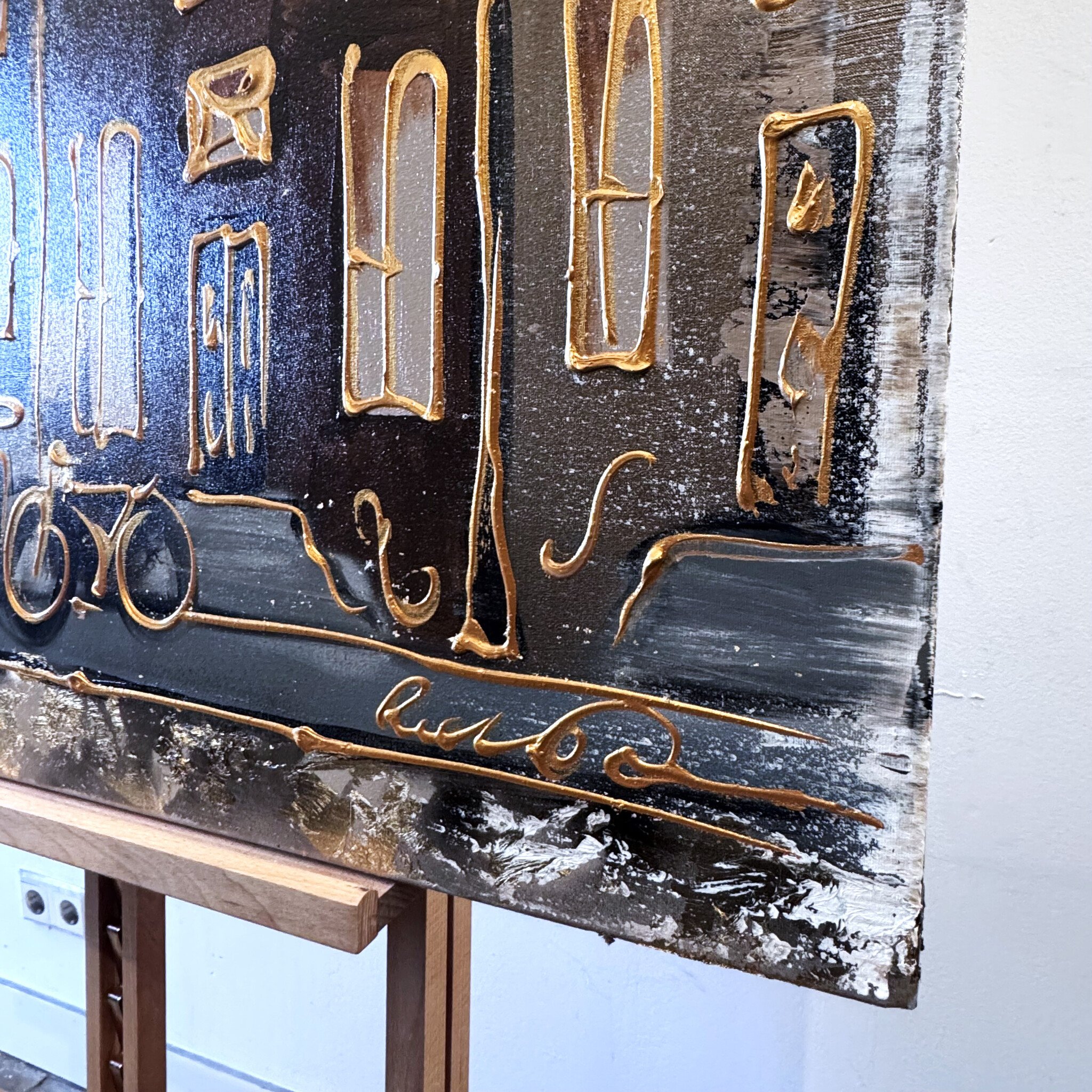 Rick bouwt zijn Amsterdam schilderijen op uit dikke lagen verf en werkt met een duidelijk handschrift wat zijn signatuur vormt. De dikke gouden lijn tekening waarmee zijn werk wordt afgemaakt doet de kijker al snel denken aan Amsterdam in de gouden eeuw.