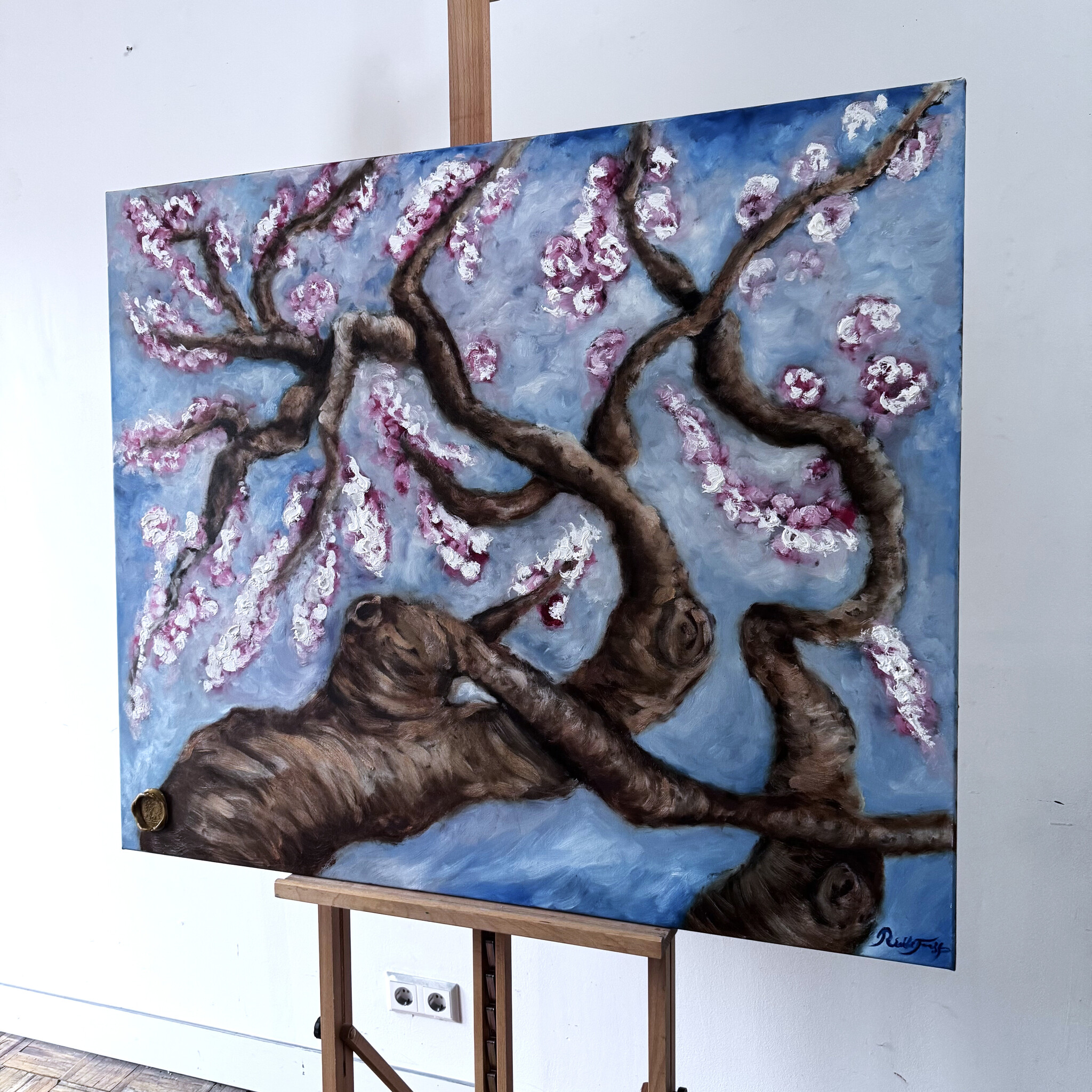Olieverf schilderij- 100x120 cm - Amandelbloesem - Prussian Blue & Gold