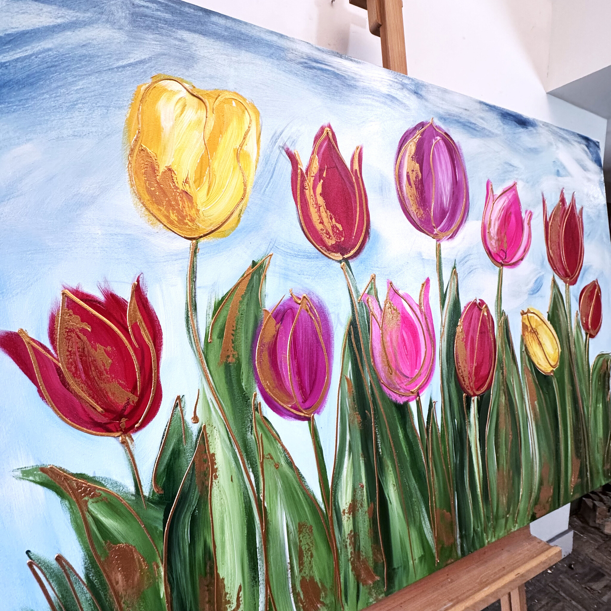Artist Note: Mijn werken in de Serie Tulp Mania, zijn gemaakt in diverse lagen acryl verf, geïnspireerd op de glacis techniek van Rembrandt. Ook zo zichtbaar is de frottis techniek van de droge kwast in combinatie met in Parijs gekocht oliepastels van Sennelier. Ook is de vrije tekenstijl van de tulpen, die ik opzet met houtskool, zeer kenmerkend. Elke laag van het werk ligt bloot door deze gemengde technieken.