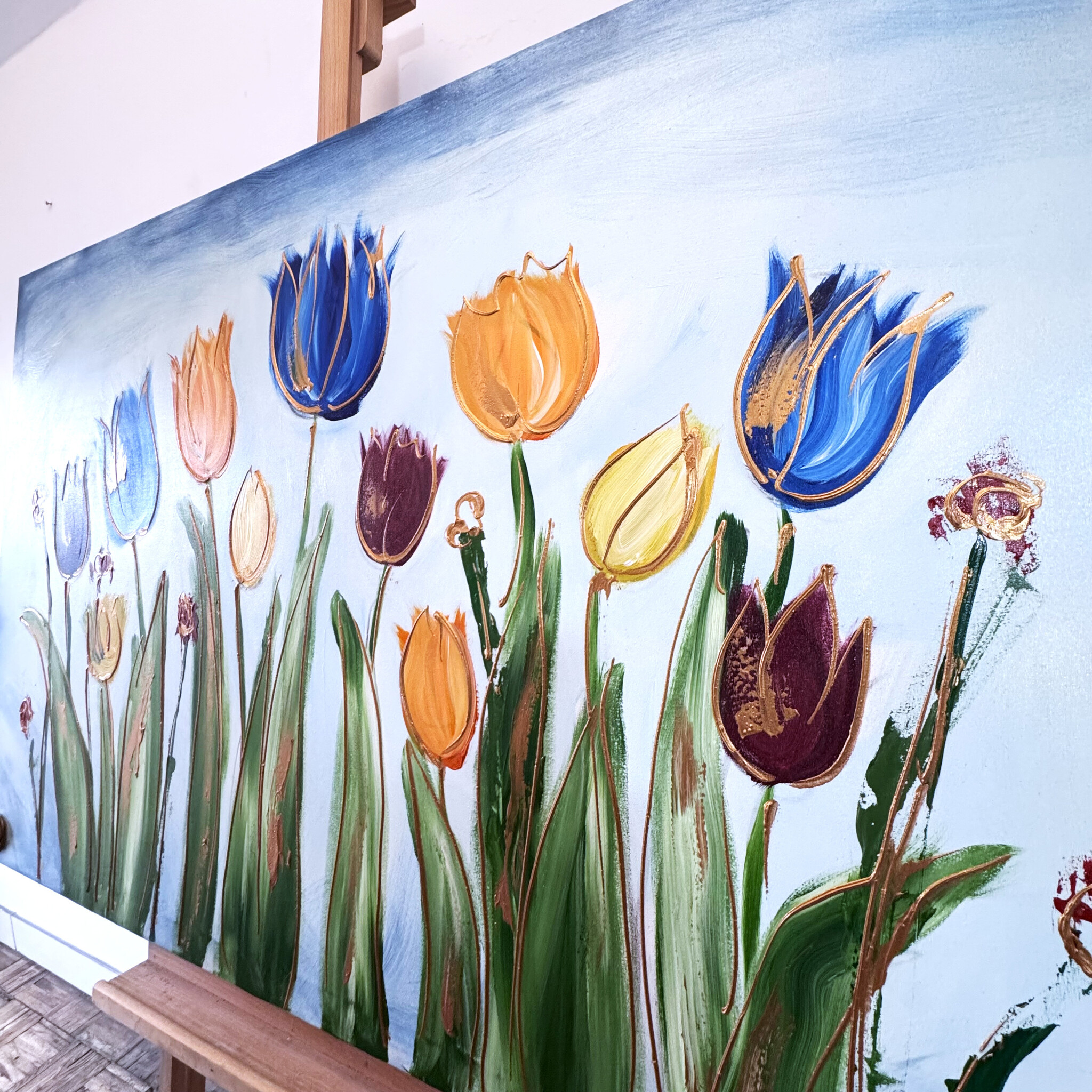 Artist Note: Mijn werken in de Serie Tulp Mania, zijn gemaakt in diverse lagen acryl verf, geïnspireerd op de glacis techniek van Rembrandt. Ook zo zichtbaar is de frottis techniek van de droge kwast in combinatie met in Parijs gekocht oliepastels van Sennelier. Ook is de vrije tekenstijl van de tulpen, die ik opzet met houtskool, zeer kenmerkend. Elke laag van het werk ligt bloot door deze gemengde technieken.