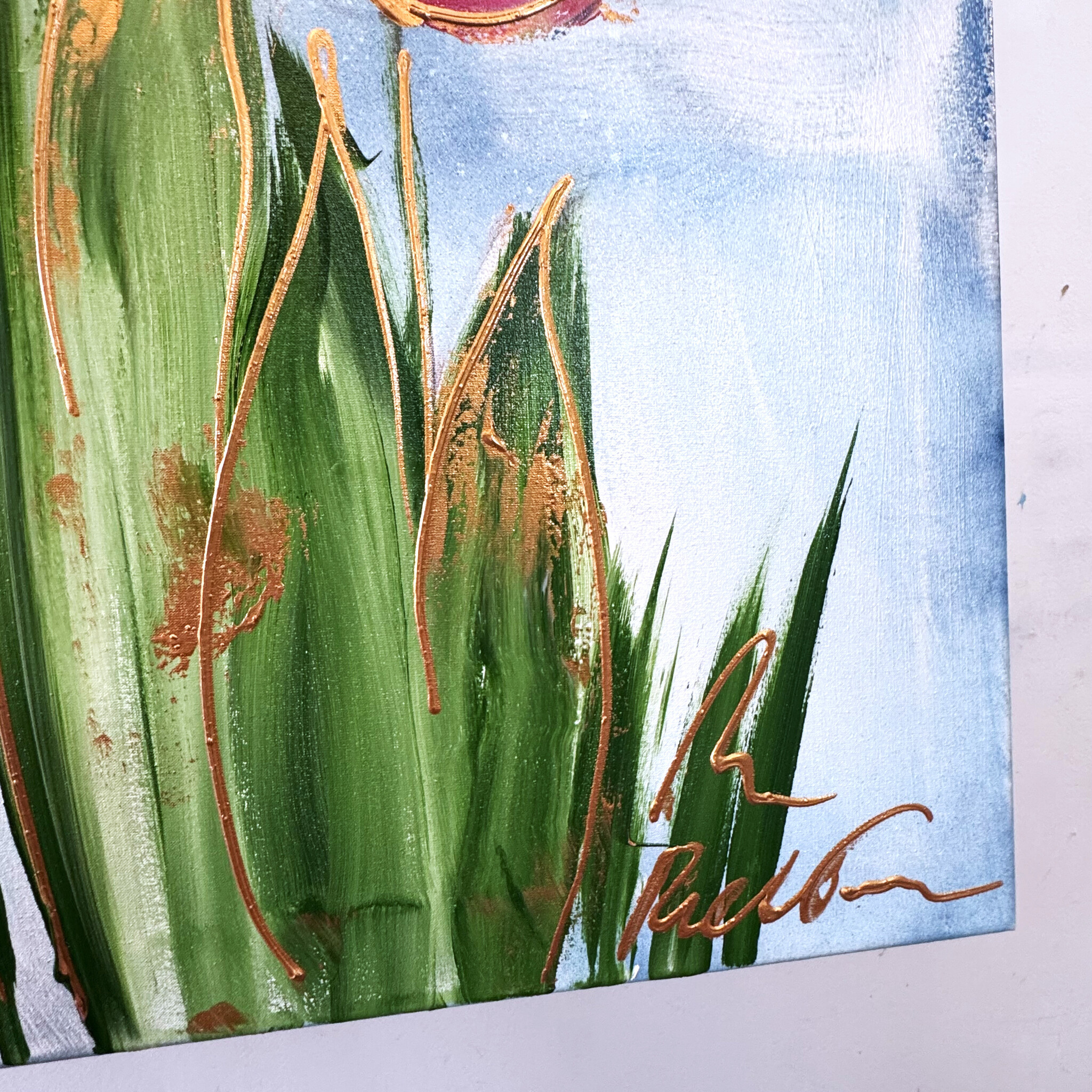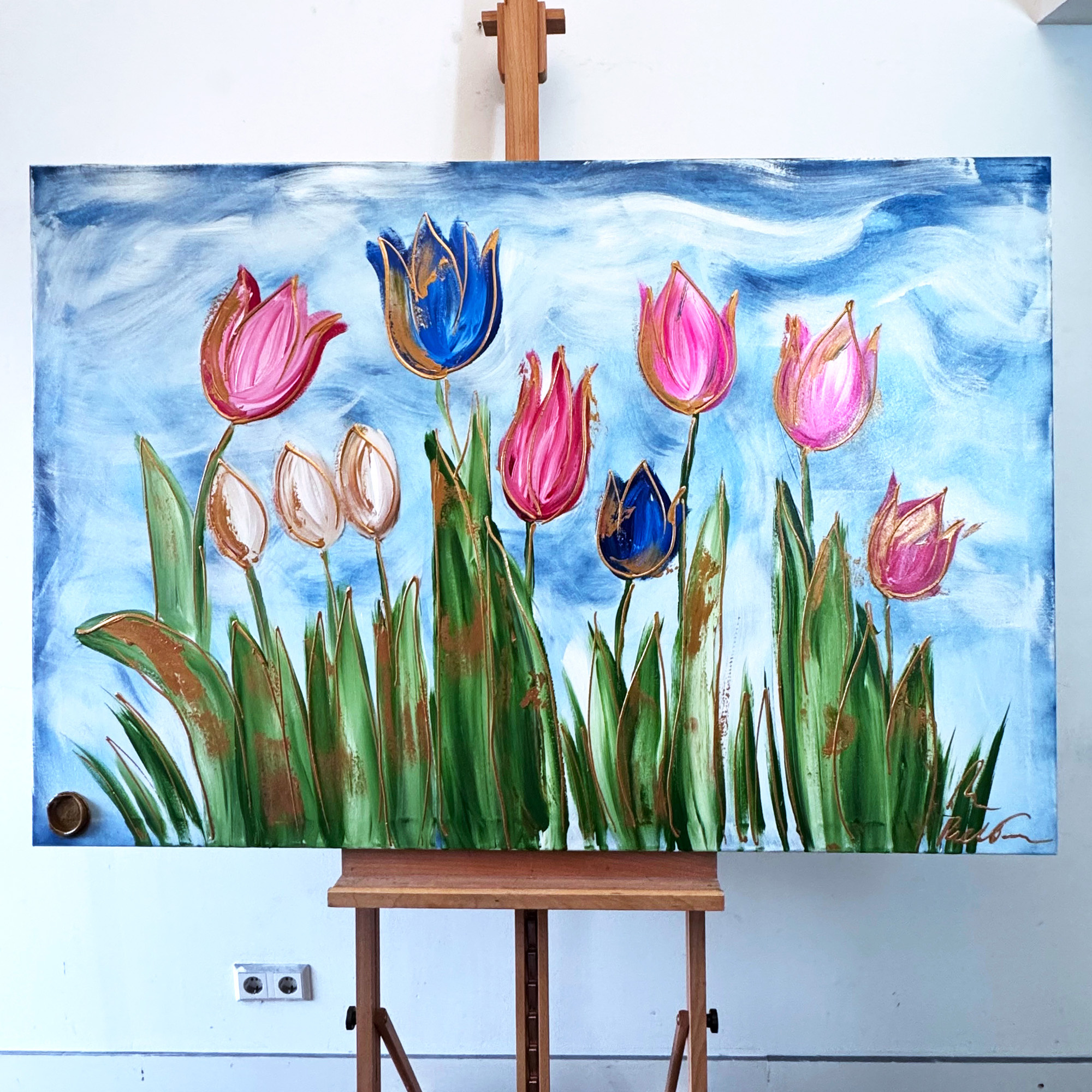Artist Note: Mijn werken in de Serie Tulp Mania, zijn gemaakt in diverse lagen acryl verf, geïnspireerd op de glacis techniek van Rembrandt. Ook zo zichtbaar is de frottis techniek van de droge kwast in combinatie met in Parijs gekocht oliepastels van Sennelier. Ook is de vrije tekenstijl van de tulpen, die ik opzet met houtskool, zeer kenmerkend. Elke laag van het werk ligt bloot door deze gemengde technieken.