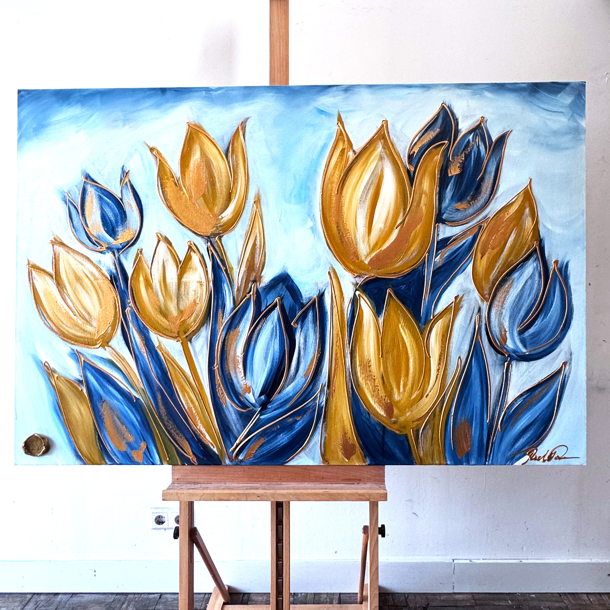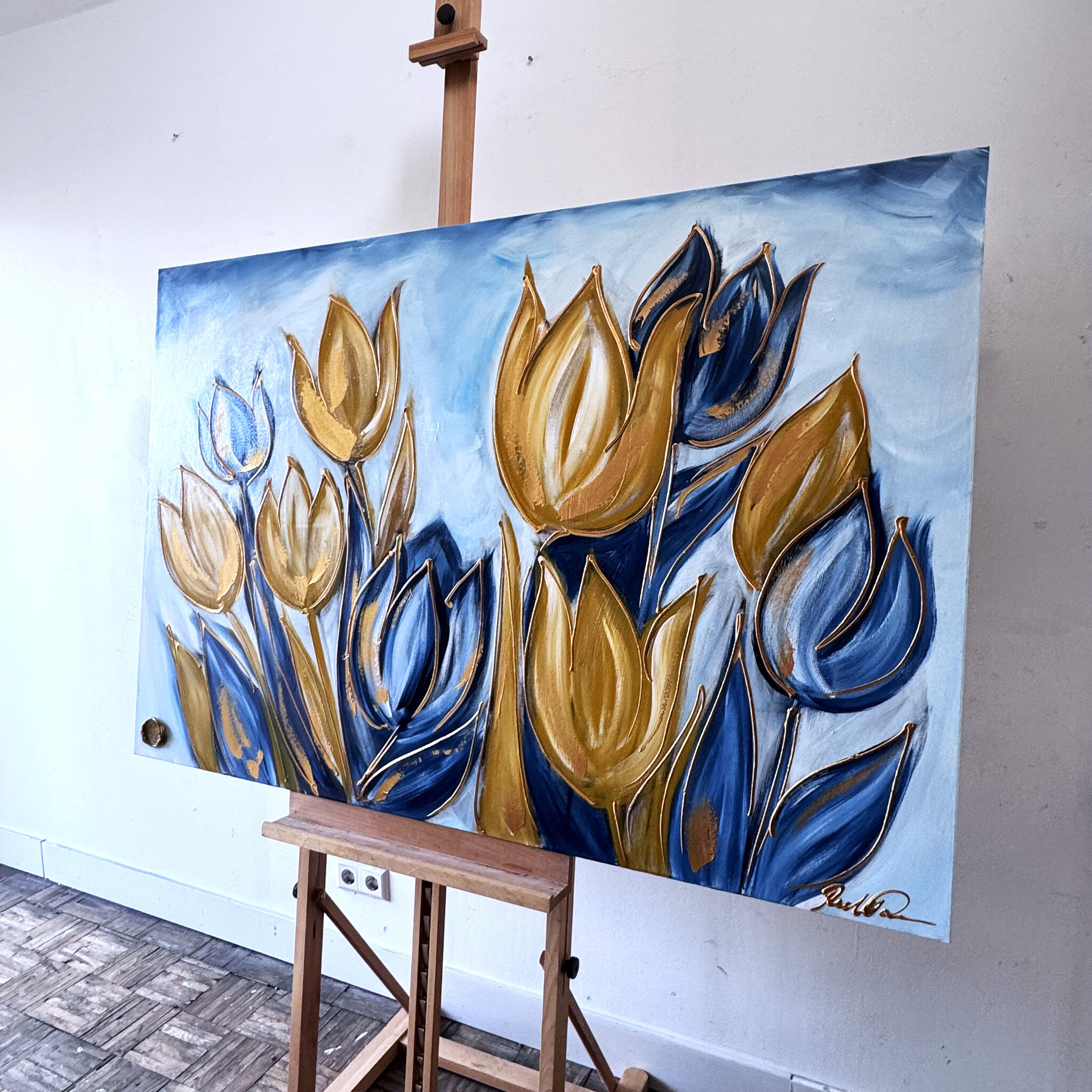 Artist Note: Mijn werken in de Serie Tulp Mania, zijn gemaakt in diverse lagen acryl verf, geïnspireerd op de glacis techniek van Rembrandt. Ook zo zichtbaar is de frottis techniek van de droge kwast in combinatie met in Parijs gekocht oliepastels van Sennelier. Ook is de vrije tekenstijl van de tulpen, die ik opzet met houtskool, zeer kenmerkend. Elke laag van het werk ligt bloot door deze gemengde technieken.