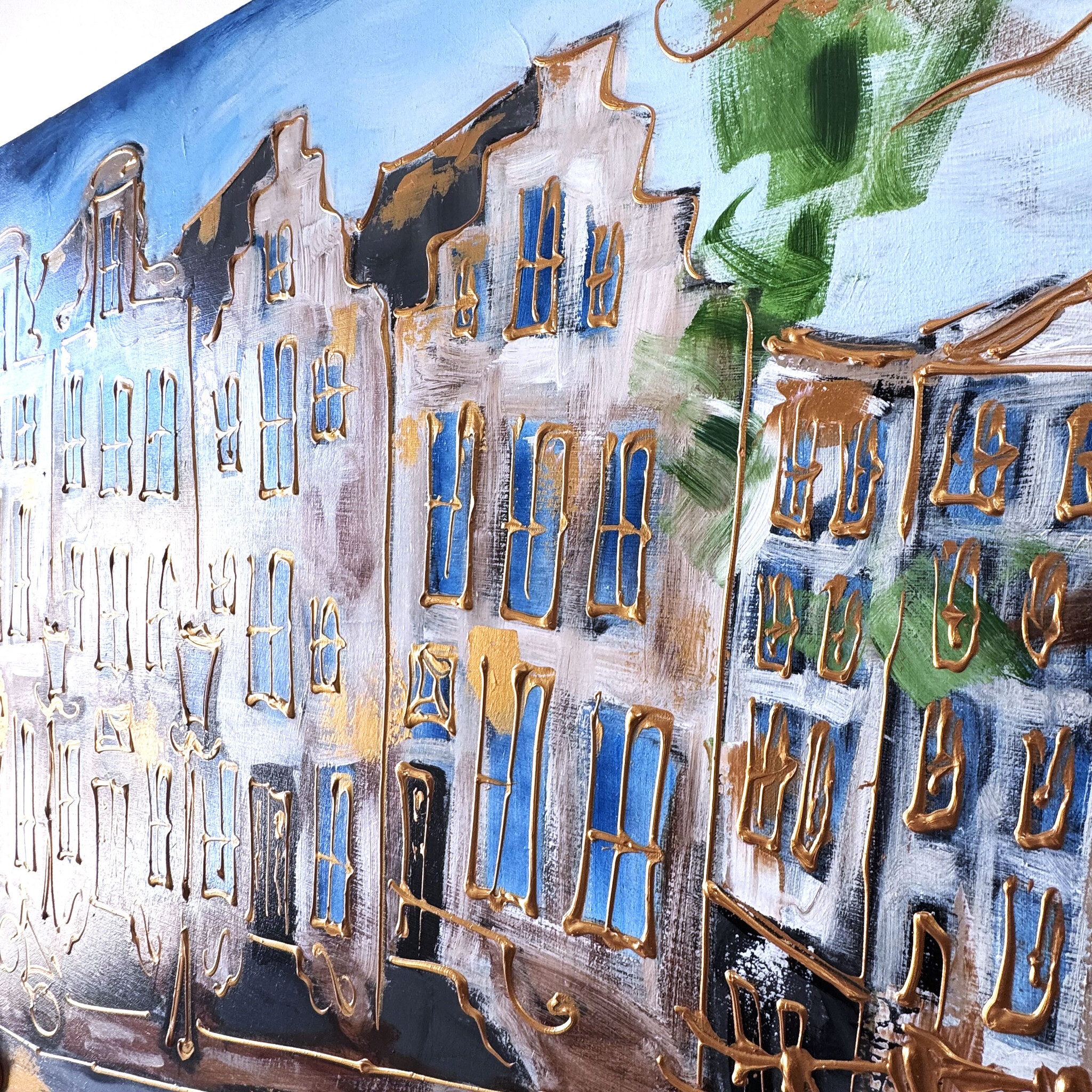 Artist Note: Mijn werken in de Amsterdam serie, zijn gemaakt in diverse lagen acryl verf, geïnspireerd op de glacis techniek van Rembrandt. Ook zo zichtbaar is de frottis techniek van de droge kwast in combinatie met in Parijs gekocht oliepastels van Sennelier (bekend van Picasso). Ook is de vrije tekenstijl, die ik opzet met houtskool, zeer kenmerkend. Elke laag van het werk ligt bloot door deze gemengde technieken.