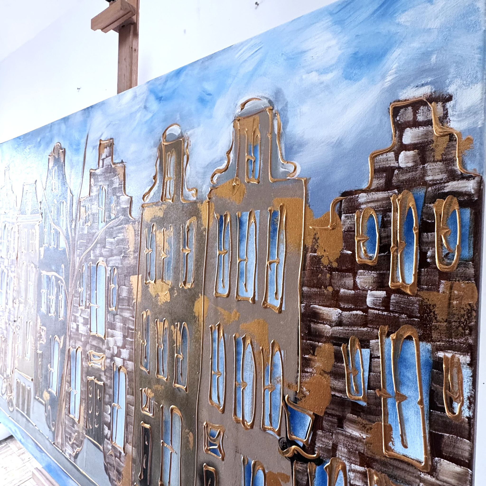 Schilderij- 100x150cm - Amsterdam Herengracht -Blue & Gold #268