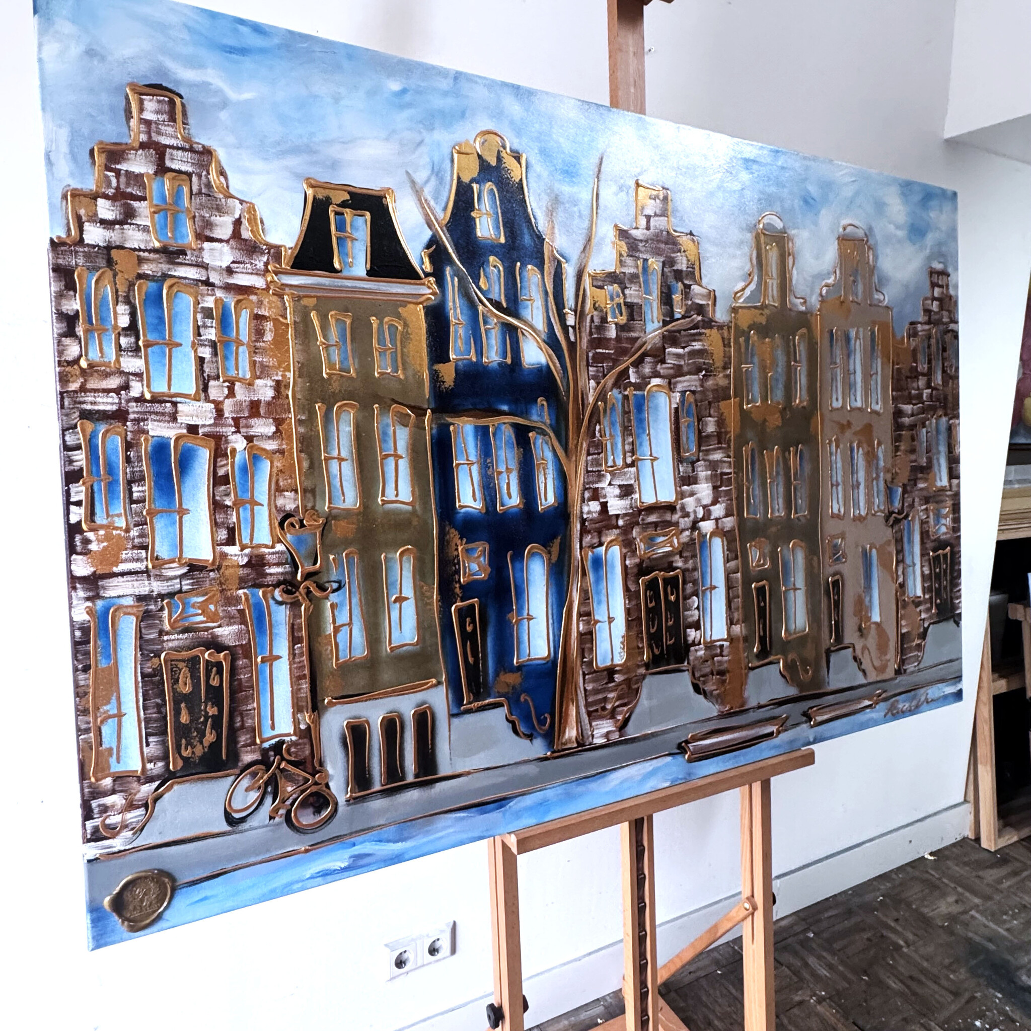 Artist Note: Mijn werken in de Amsterdam serie, zijn gemaakt in diverse lagen acryl verf, geïnspireerd op de glacis techniek van Rembrandt. Ook zo zichtbaar is de frottis techniek van de droge kwast in combinatie met in Parijs gekocht oliepastels van Sennelier (bekend van Picasso). Ook is de vrije tekenstijl, die ik opzet met houtskool, zeer kenmerkend. Elke laag van het werk ligt bloot door deze gemengde technieken.