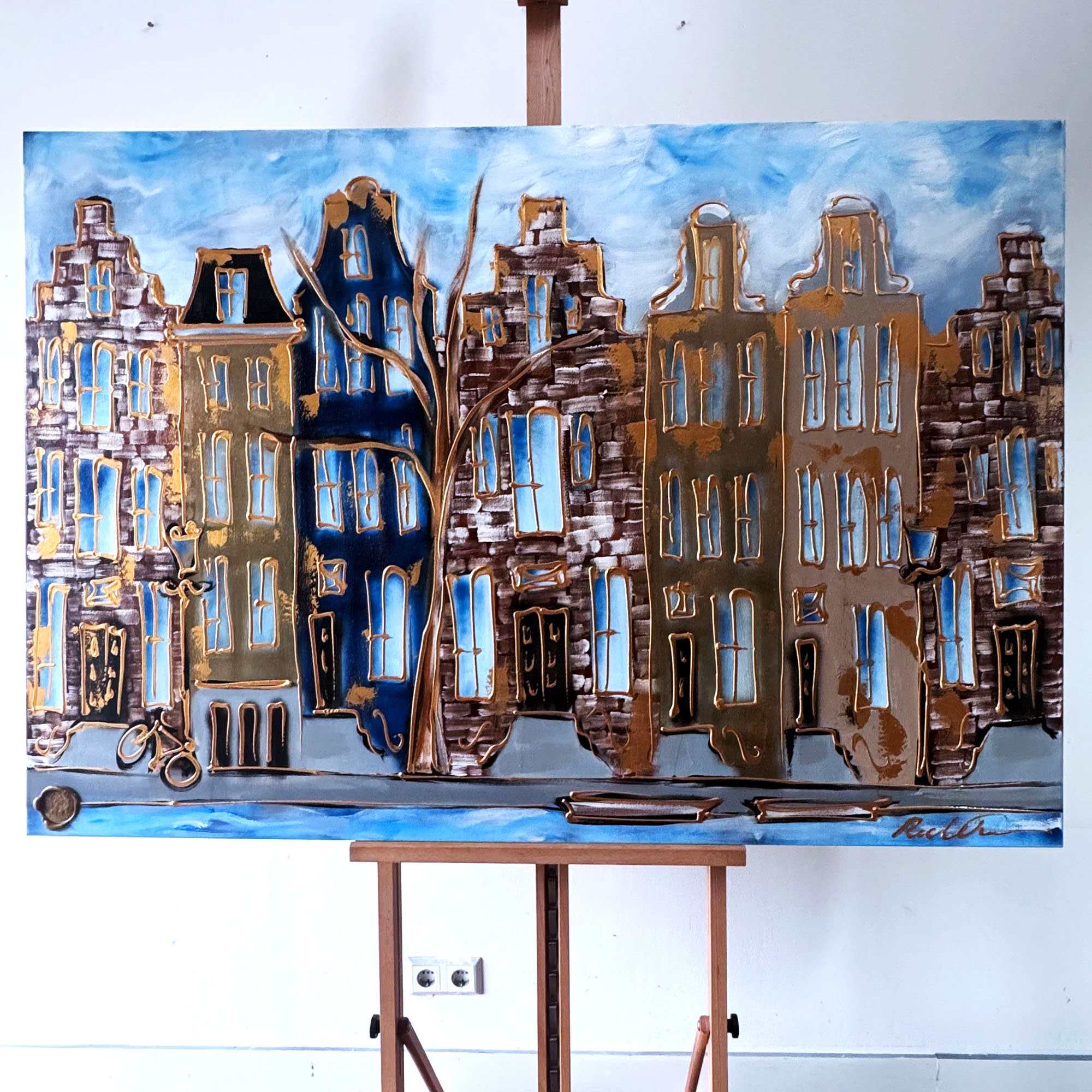 Rick bouwt zijn Amsterdam schilderijen op uit dikke lagen verf en werkt met een duidelijk handschrift wat zijn signatuur vormt. De dikke gouden lijn tekening waarmee zijn werk wordt afgemaakt doet de kijker al snel denken aan Amsterdam in de gouden eeuw.