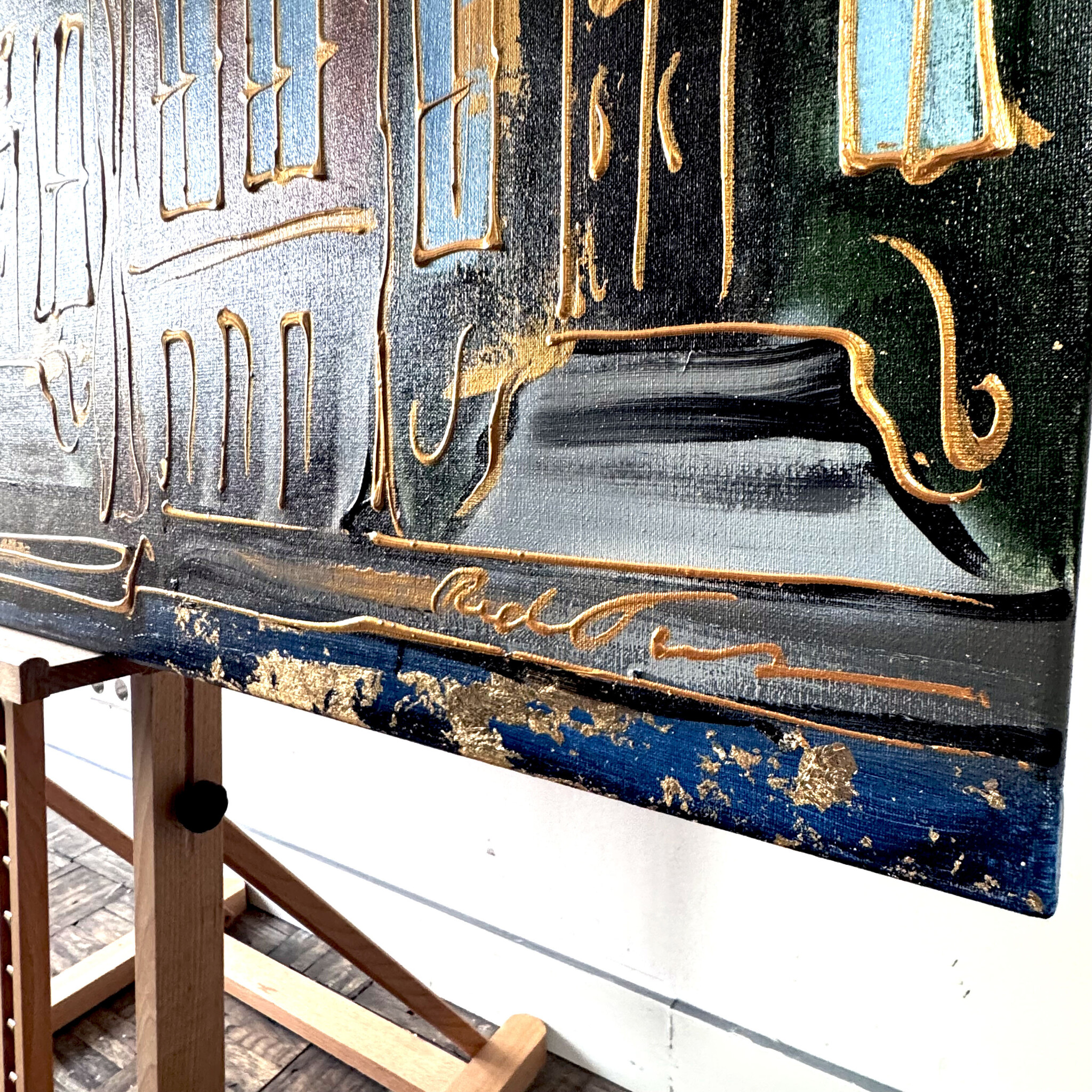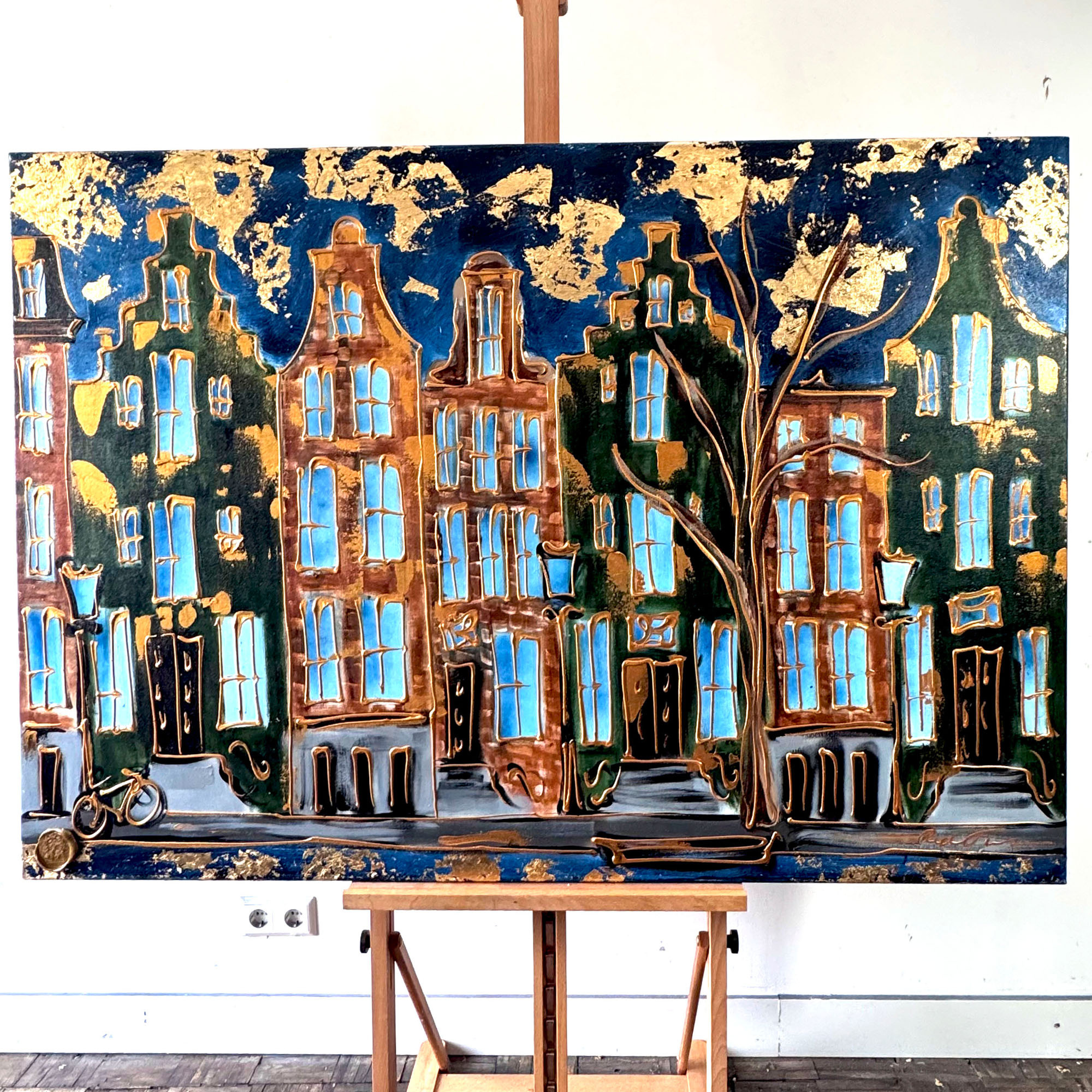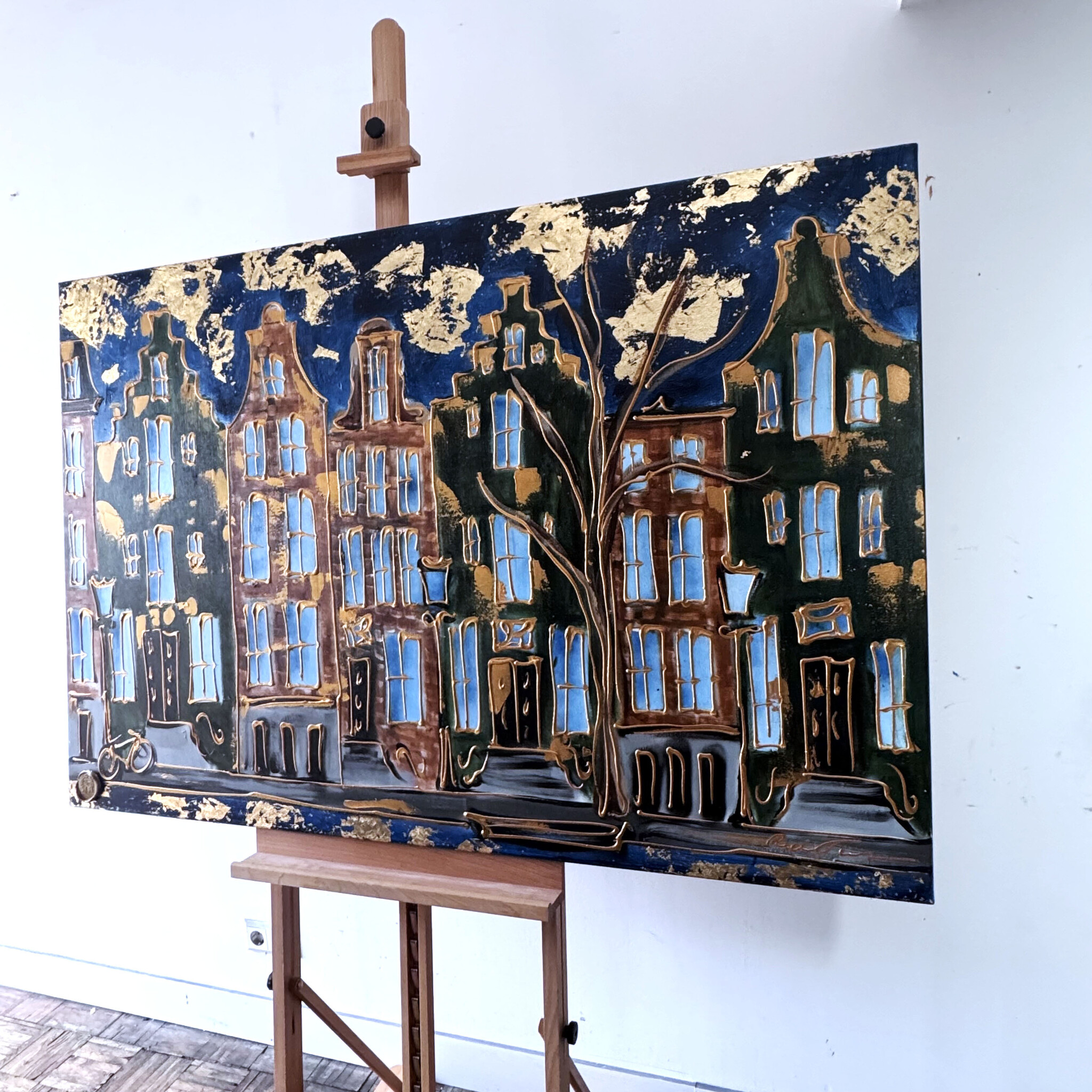 Rick bouwt zijn Amsterdam schilderijen op uit dikke lagen verf en werkt met een duidelijk handschrift wat zijn signatuur vormt. De dikke gouden lijn tekening waarmee zijn werk wordt afgemaakt doet de kijker al snel denken aan Amsterdam in de gouden eeuw.