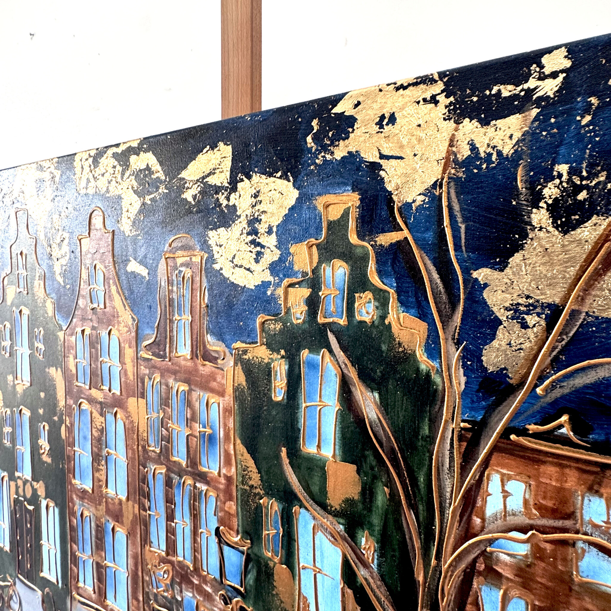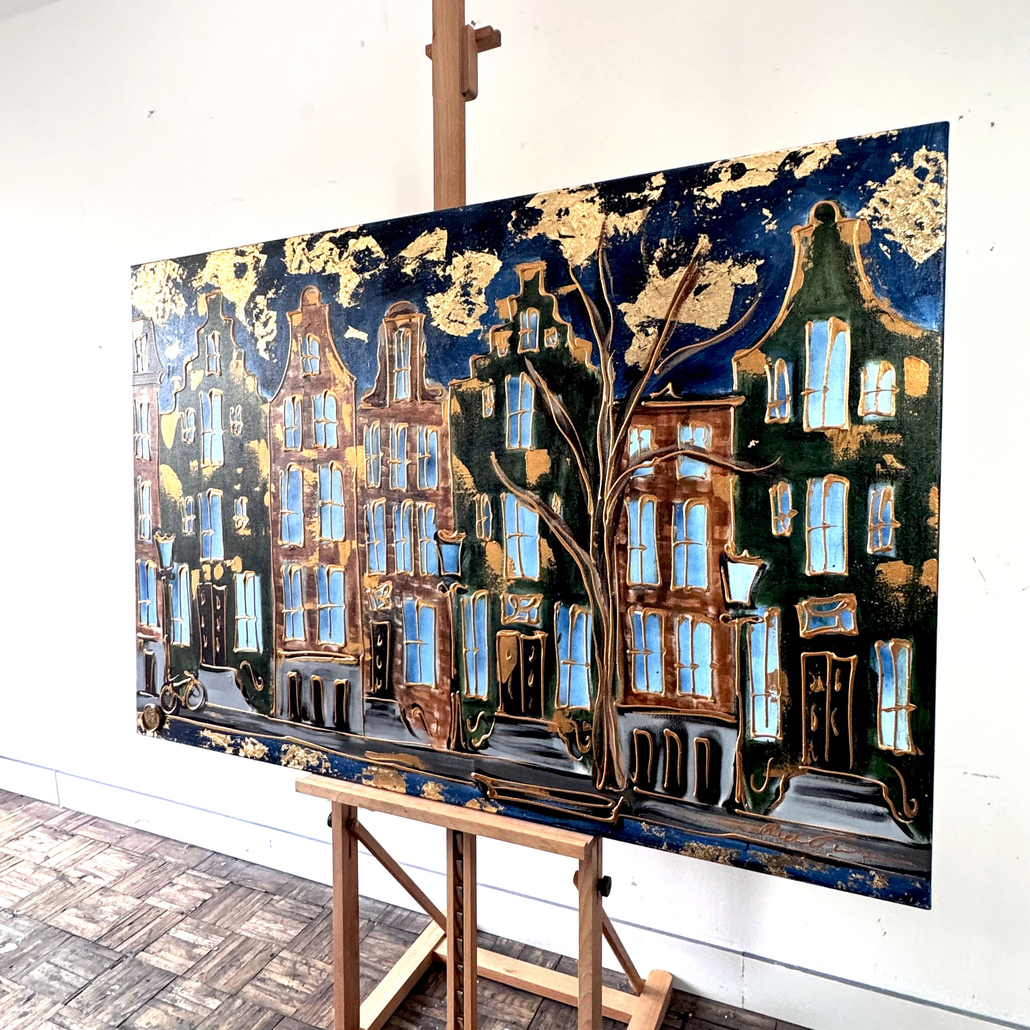 Artist Note: Mijn werken in de Amsterdam serie, zijn gemaakt in diverse lagen acryl verf, geïnspireerd op de glacis techniek van Rembrandt. Ook zo zichtbaar is de frottis techniek van de droge kwast in combinatie met in Parijs gekocht oliepastels van Sennelier (bekend van Picasso). Ook is de vrije tekenstijl, die ik opzet met houtskool, zeer kenmerkend. Elke laag van het werk ligt bloot door deze gemengde technieken.