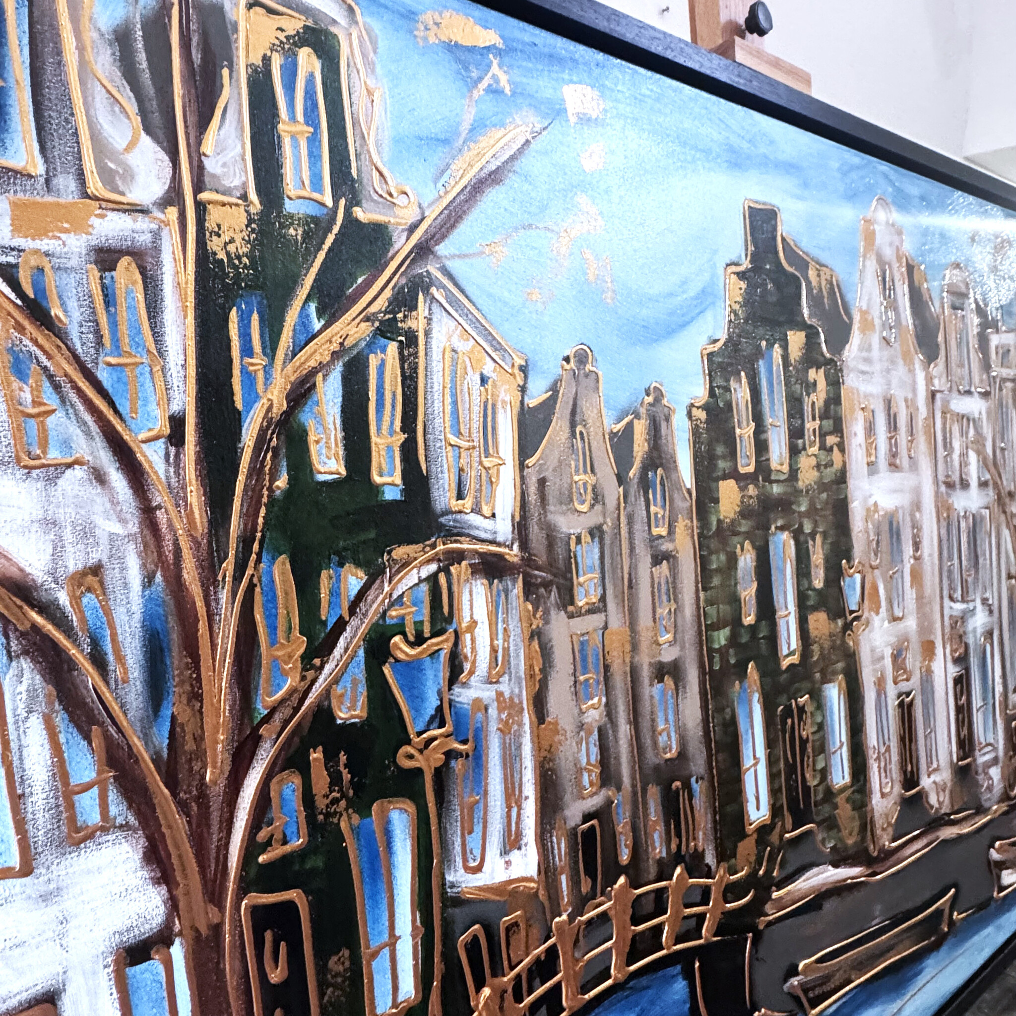 Rick bouwt zijn Amsterdam schilderijen op uit dikke lagen verf en werkt met een duidelijk handschrift wat zijn signatuur vormt. De dikke gouden lijn tekening waarmee zijn werk wordt afgemaakt doet de kijker al snel denken aan Amsterdam in de gouden eeuw.