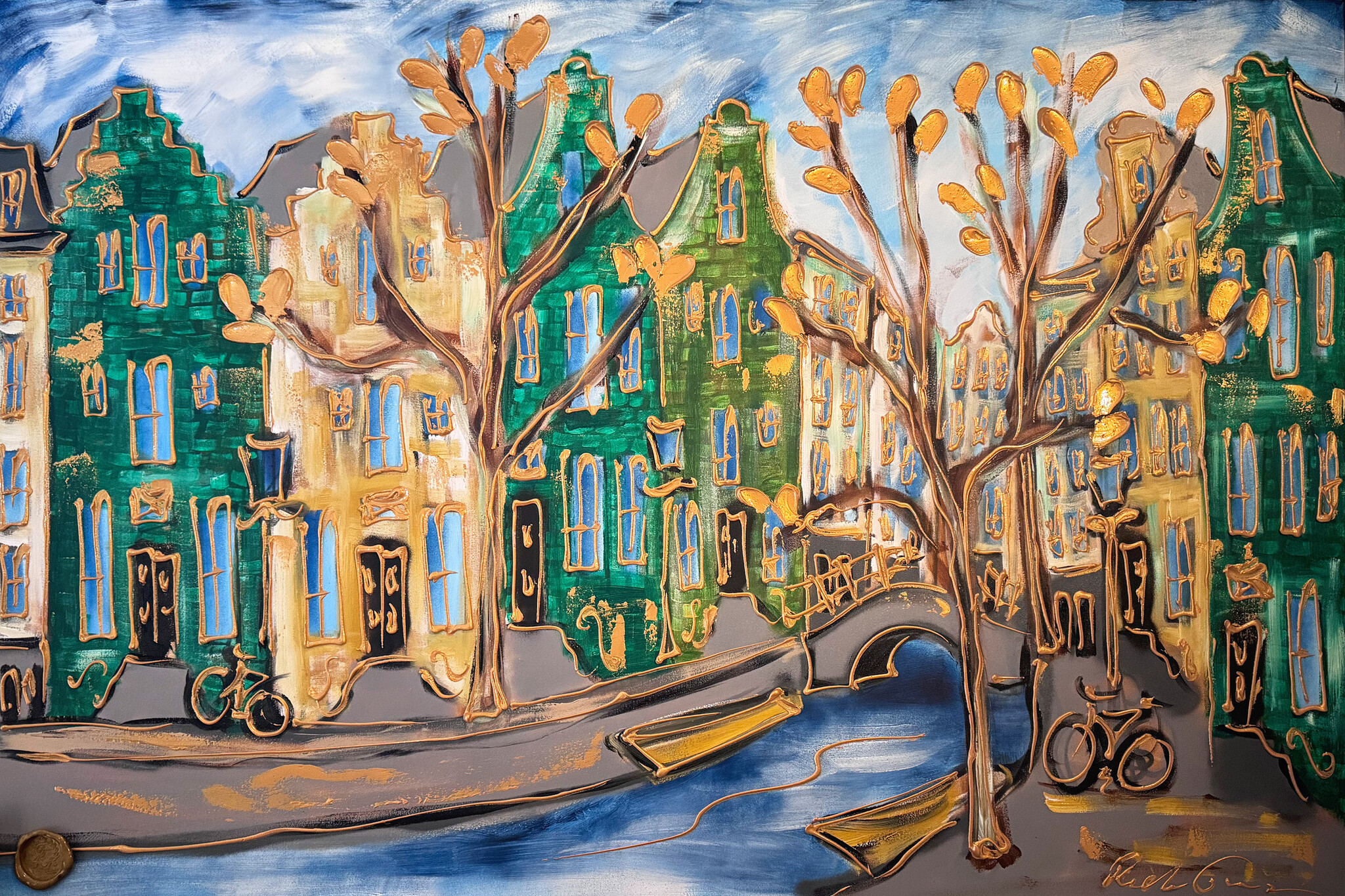 Rick bouwt zijn Amsterdam schilderijen op uit dikke lagen verf en werkt met een duidelijk handschrift wat zijn signatuur vormt. De dikke gouden lijn tekening waarmee zijn werk wordt afgemaakt doet de kijker al snel denken aan Amsterdam in de gouden eeuw.