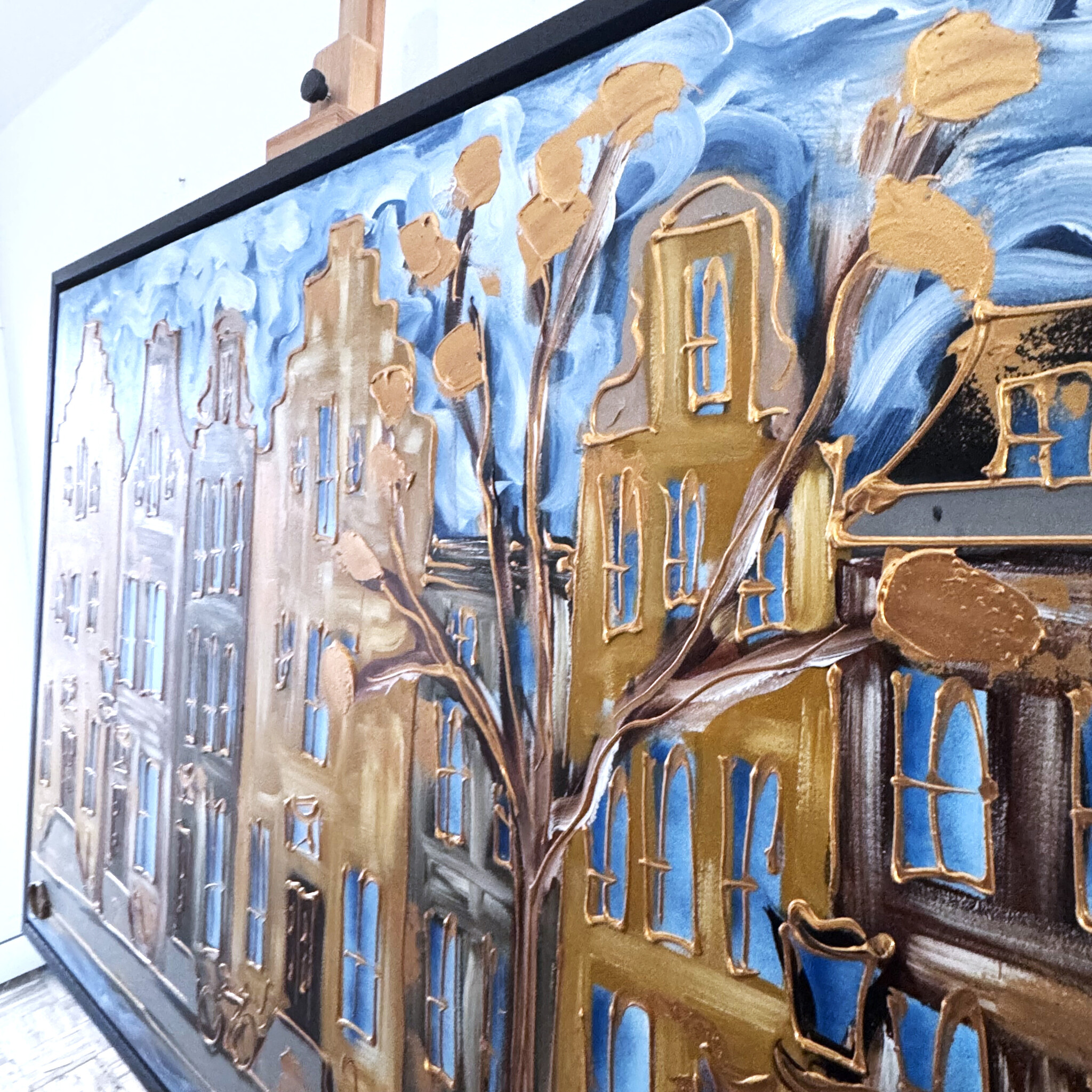 Artist Note: Mijn werken in de Amsterdam serie, zijn gemaakt in diverse lagen acryl verf, geïnspireerd op de glacis techniek van Rembrandt. Ook zo zichtbaar is de frottis techniek van de droge kwast in combinatie met in Parijs gekocht oliepastels van Sennelier (bekend van Picasso). Ook is de vrije tekenstijl, die ik opzet met houtskool, zeer kenmerkend. Elke laag van het werk ligt bloot door deze gemengde technieken.