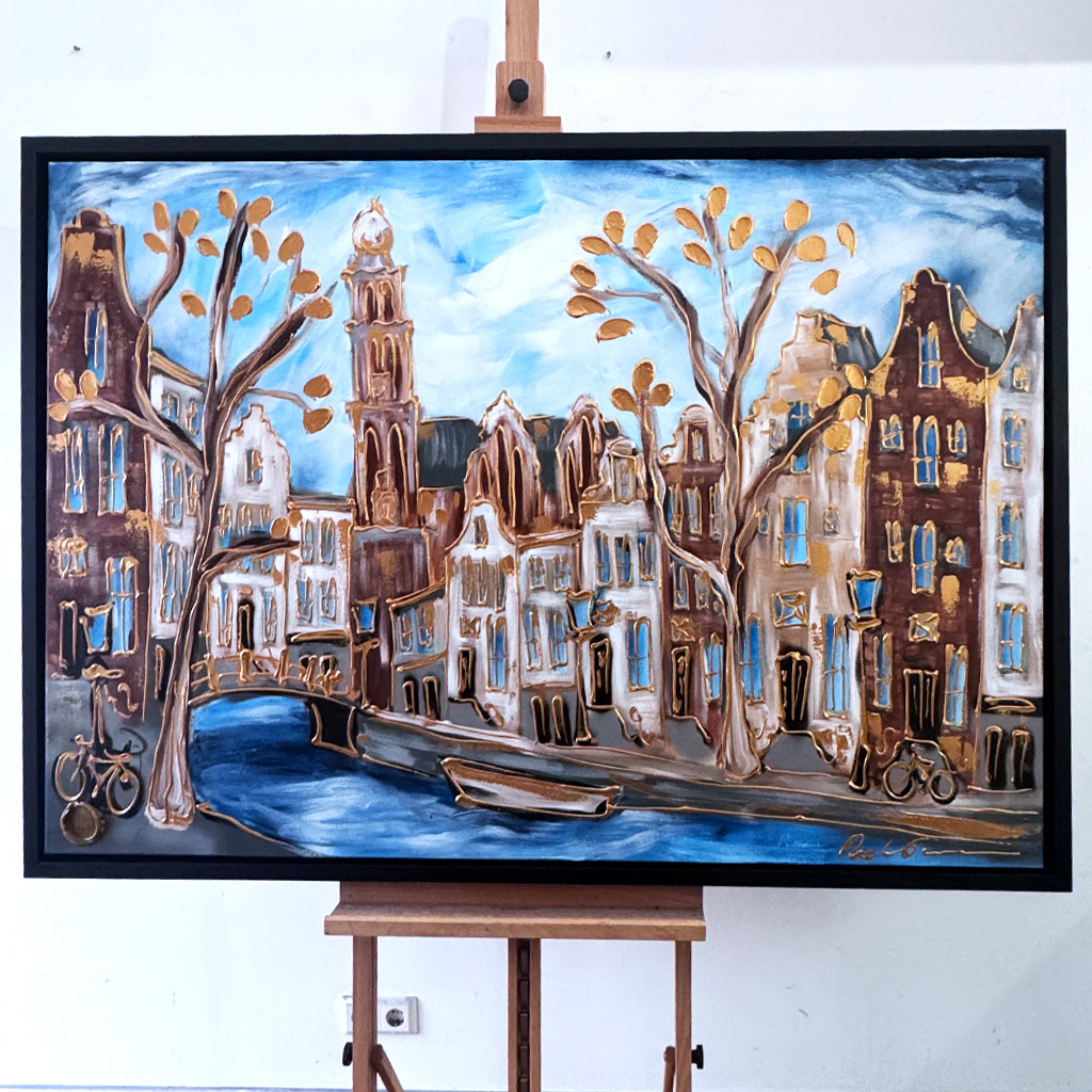 Rick bouwt zijn Amsterdam schilderijen op uit dikke lagen verf en werkt met een duidelijk handschrift wat zijn signatuur vormt. De dikke gouden lijn tekening waarmee zijn werk wordt afgemaakt doet de kijker al snel denken aan Amsterdam in de gouden eeuw.