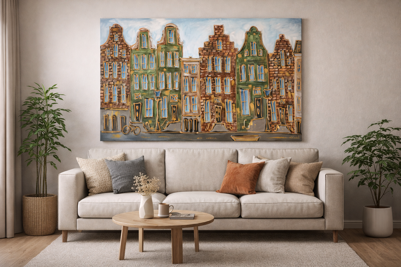 Artist Note: Mijn werken in de Amsterdam serie, zijn gemaakt in diverse lagen acryl verf, geïnspireerd op de glacis techniek van Rembrandt. Ook zo zichtbaar is de frottis techniek van de droge kwast in combinatie met in Parijs gekocht oliepastels van Sennelier (bekend van Picasso). Ook is de vrije tekenstijl, die ik opzet met houtskool, zeer kenmerkend. Elke laag van het werk ligt bloot door deze gemengde technieken.