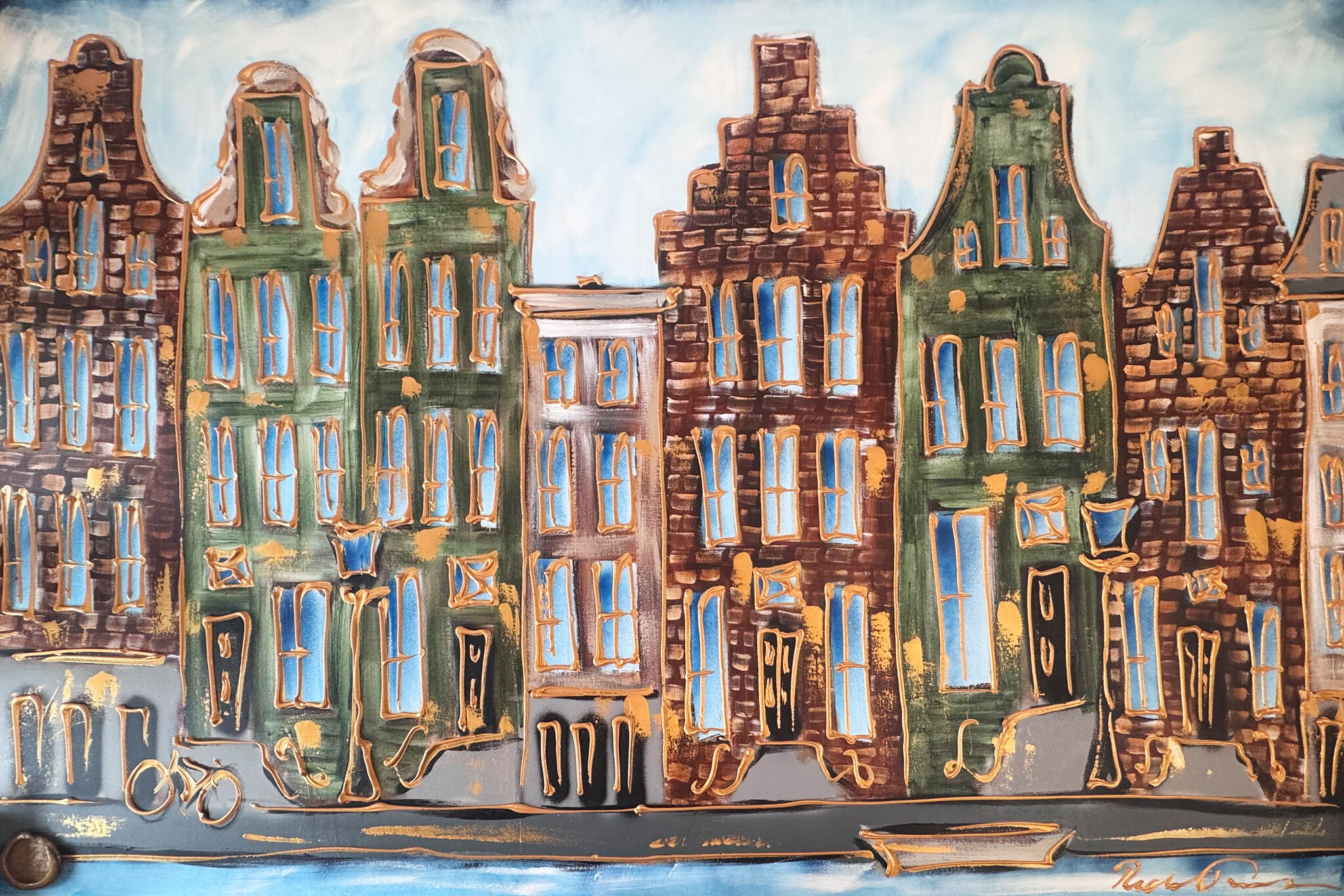 Rick bouwt zijn Amsterdam schilderijen op uit dikke lagen verf en werkt met een duidelijk handschrift wat zijn signatuur vormt. De dikke gouden lijn tekening waarmee zijn werk wordt afgemaakt doet de kijker al snel denken aan Amsterdam in de gouden eeuw.