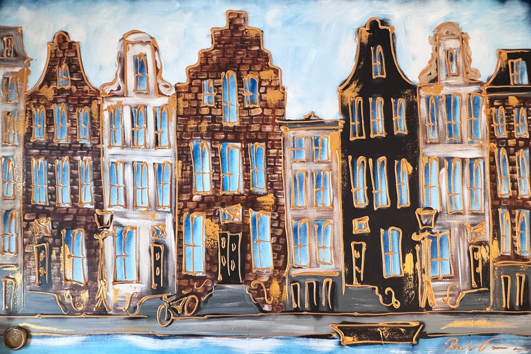 Rick bouwt zijn Amsterdam schilderijen op uit dikke lagen verf en werkt met een duidelijk handschrift wat zijn signatuur vormt. De dikke gouden lijn tekening waarmee zijn werk wordt afgemaakt doet de kijker al snel denken aan Amsterdam in de gouden eeuw.