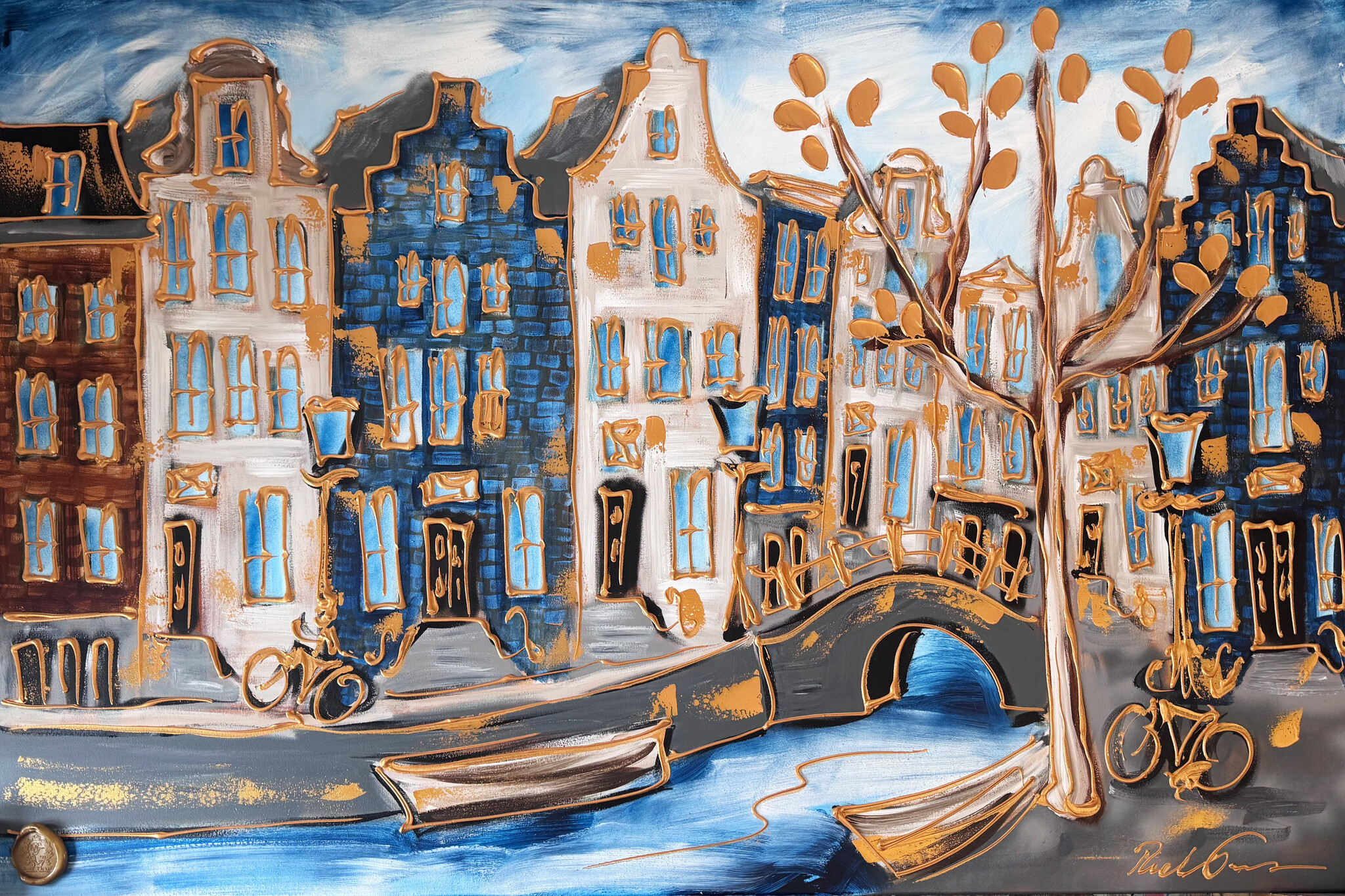 Schilderij- 100x150cm - Amsterdam Herengracht -Blue & Gold #300