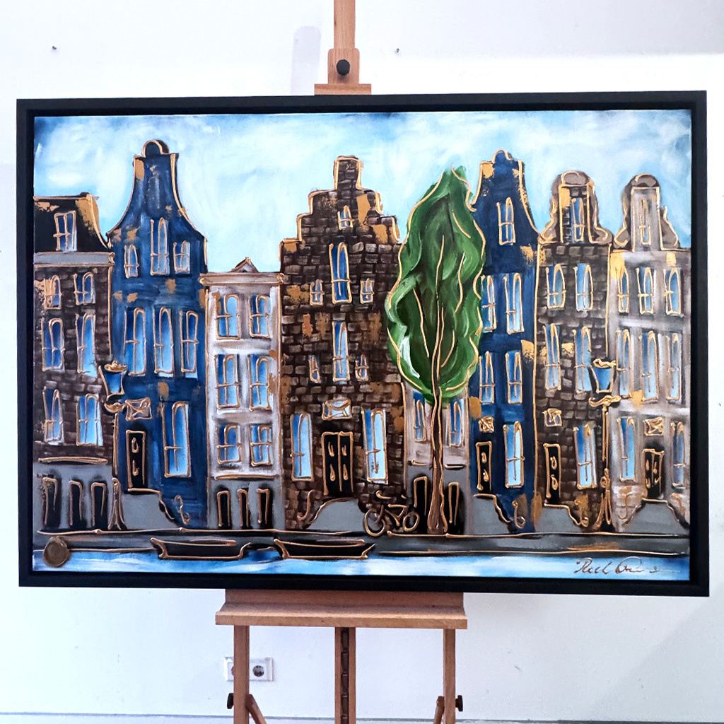 Rick bouwt zijn Amsterdam schilderijen op uit dikke lagen verf en werkt met een duidelijk handschrift wat zijn signatuur vormt. De dikke gouden lijn tekening waarmee zijn werk wordt afgemaakt doet de kijker al snel denken aan Amsterdam in de gouden eeuw.
