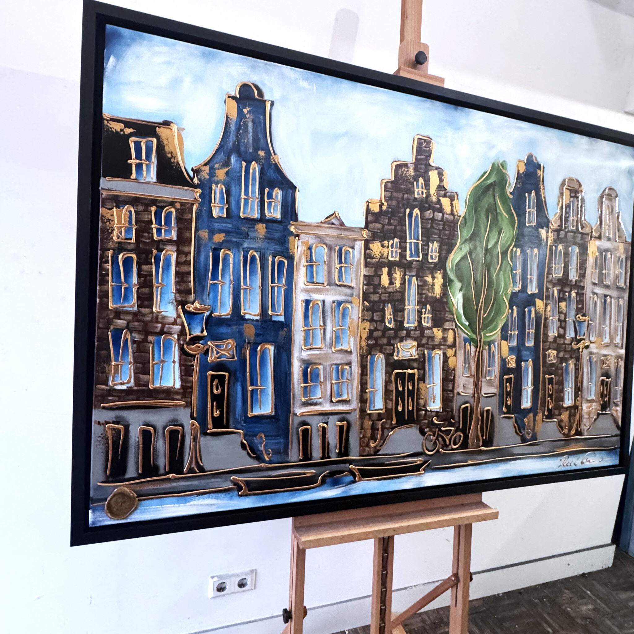 Artist Note: Mijn werken in de Amsterdam serie, zijn gemaakt in diverse lagen acryl verf, geïnspireerd op de glacis techniek van Rembrandt. Ook zo zichtbaar is de frottis techniek van de droge kwast in combinatie met in Parijs gekocht oliepastels van Sennelier (bekend van Picasso). Ook is de vrije tekenstijl, die ik opzet met houtskool, zeer kenmerkend. Elke laag van het werk ligt bloot door deze gemengde technieken.