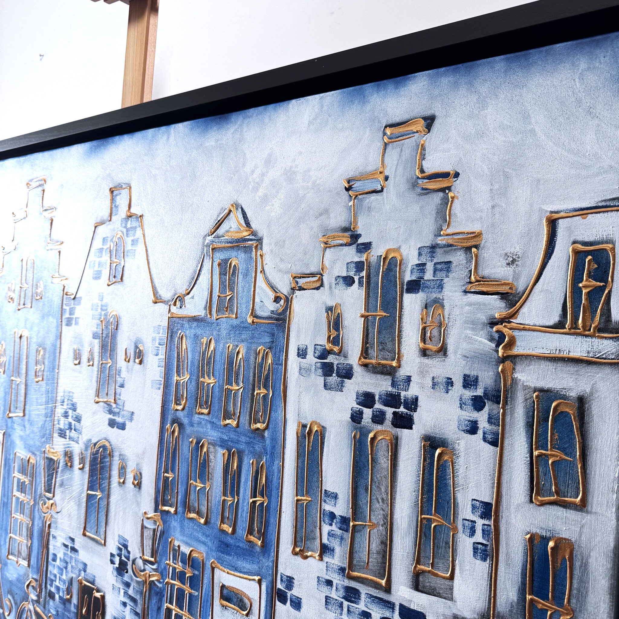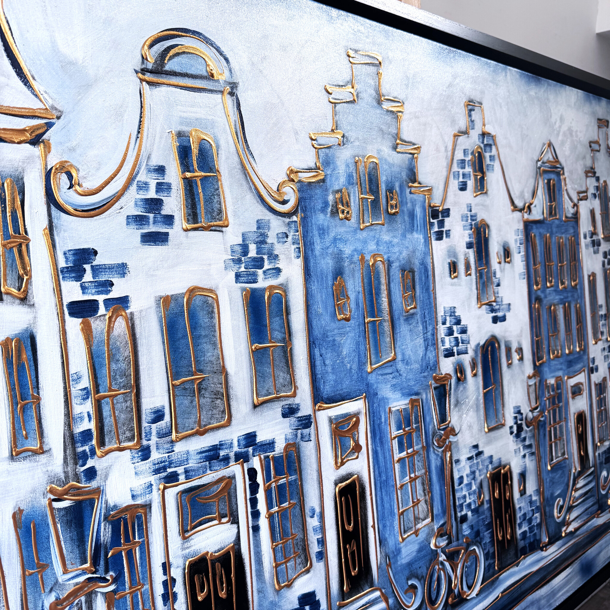 Artist Note: Mijn werken in de Amsterdam serie, zijn gemaakt in diverse lagen acryl verf, geïnspireerd op de glacis techniek van Rembrandt. Ook zo zichtbaar is de frottis techniek van de droge kwast in combinatie met in Parijs gekocht oliepastels van Sennelier (bekend van Picasso). Ook is de vrije tekenstijl, die ik opzet met houtskool, zeer kenmerkend. Elke laag van het werk ligt bloot door deze gemengde technieken.