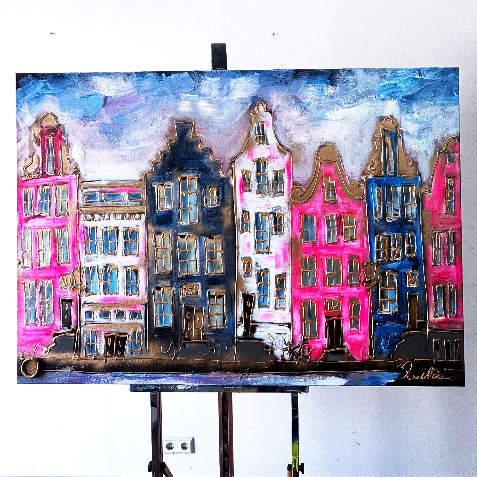Rick bouwt zijn Amsterdam schilderijen op uit dikke lagen verf en werkt met een duidelijk handschrift wat zijn signatuur vormt. De dikke gouden lijn tekening waarmee zijn werk wordt afgemaakt doet de kijker al snel denken aan Amsterdam in de gouden eeuw.