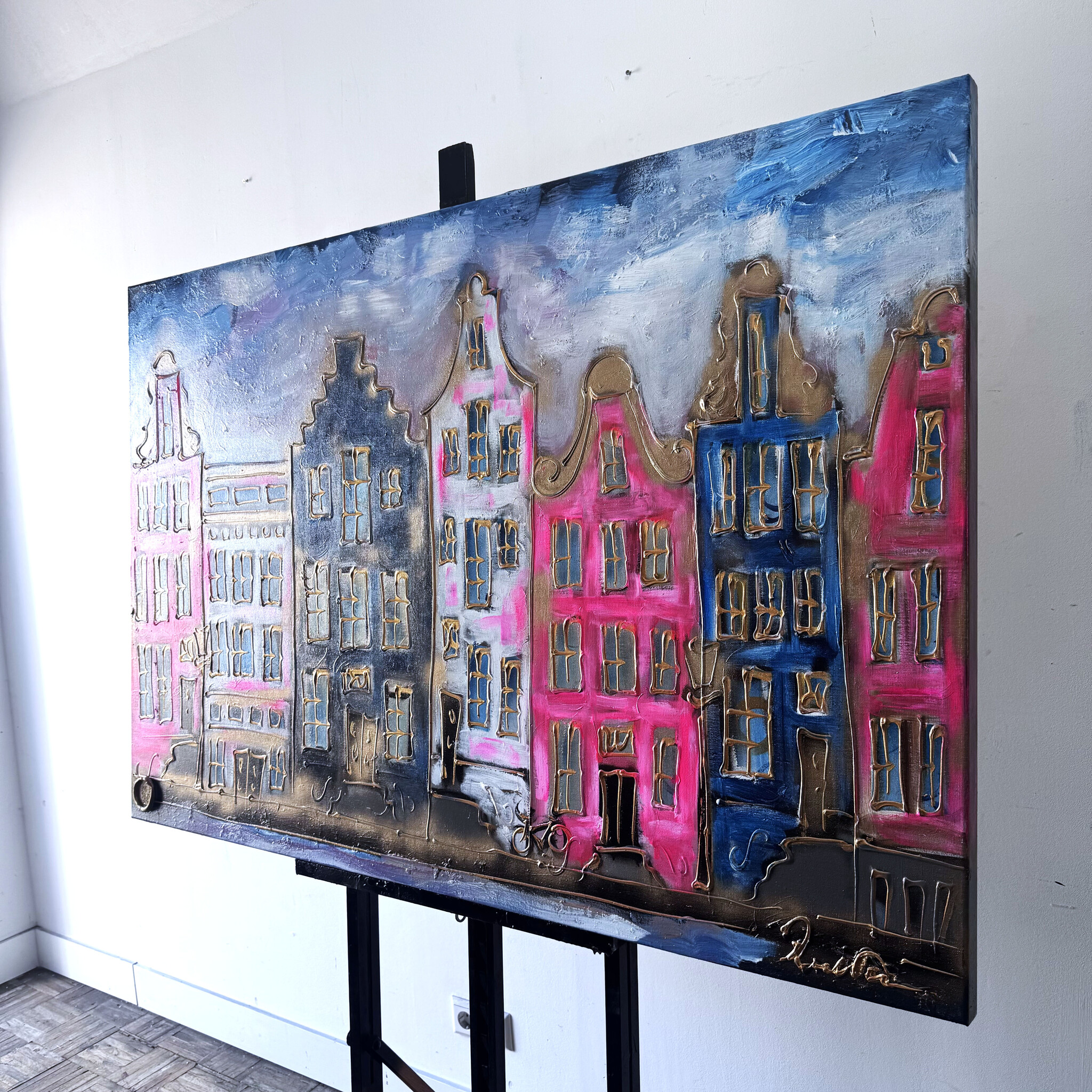 Artist Note: Mijn werken in de Amsterdam serie, zijn gemaakt in diverse lagen acryl verf, geïnspireerd op de glacis techniek van Rembrandt. Ook zo zichtbaar is de frottis techniek van de droge kwast in combinatie met in Parijs gekocht oliepastels van Sennelier (bekend van Picasso). Ook is de vrije tekenstijl, die ik opzet met houtskool, zeer kenmerkend. Elke laag van het werk ligt bloot door deze gemengde technieken.