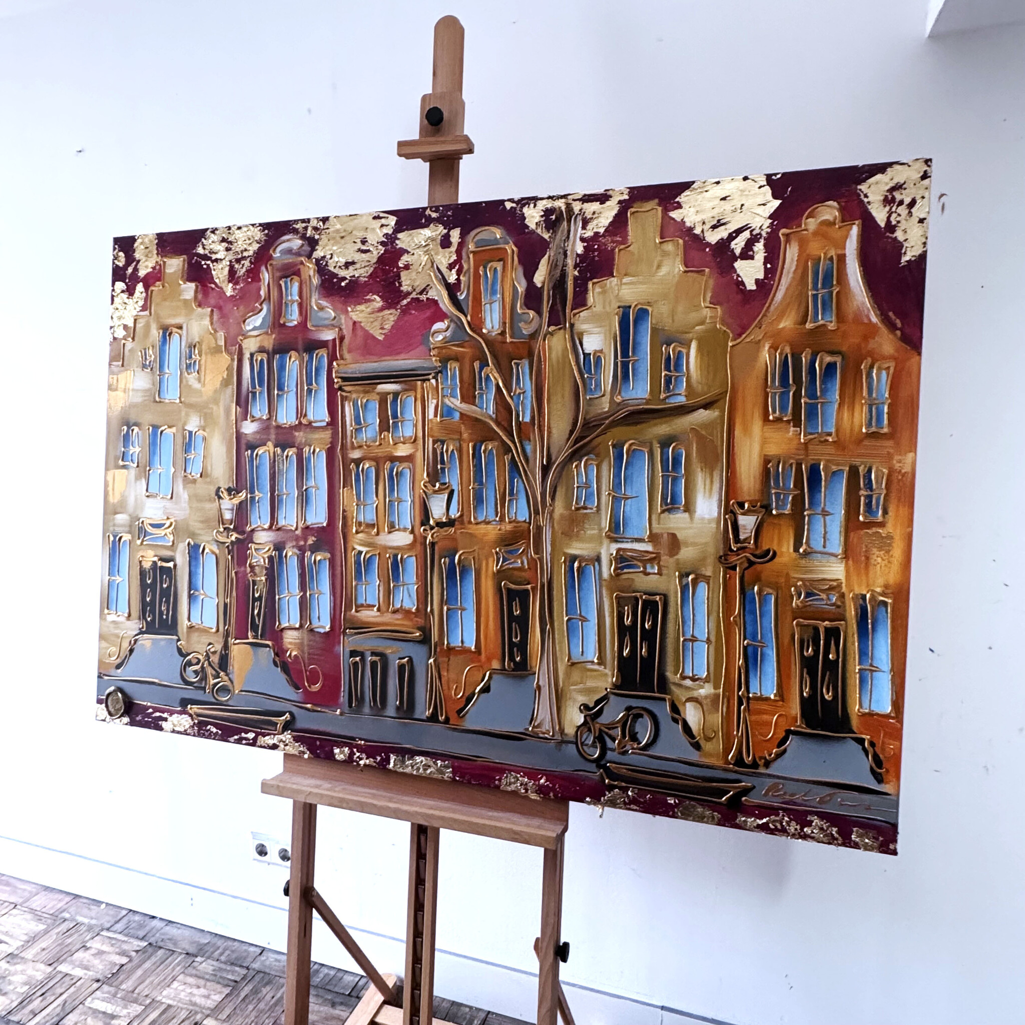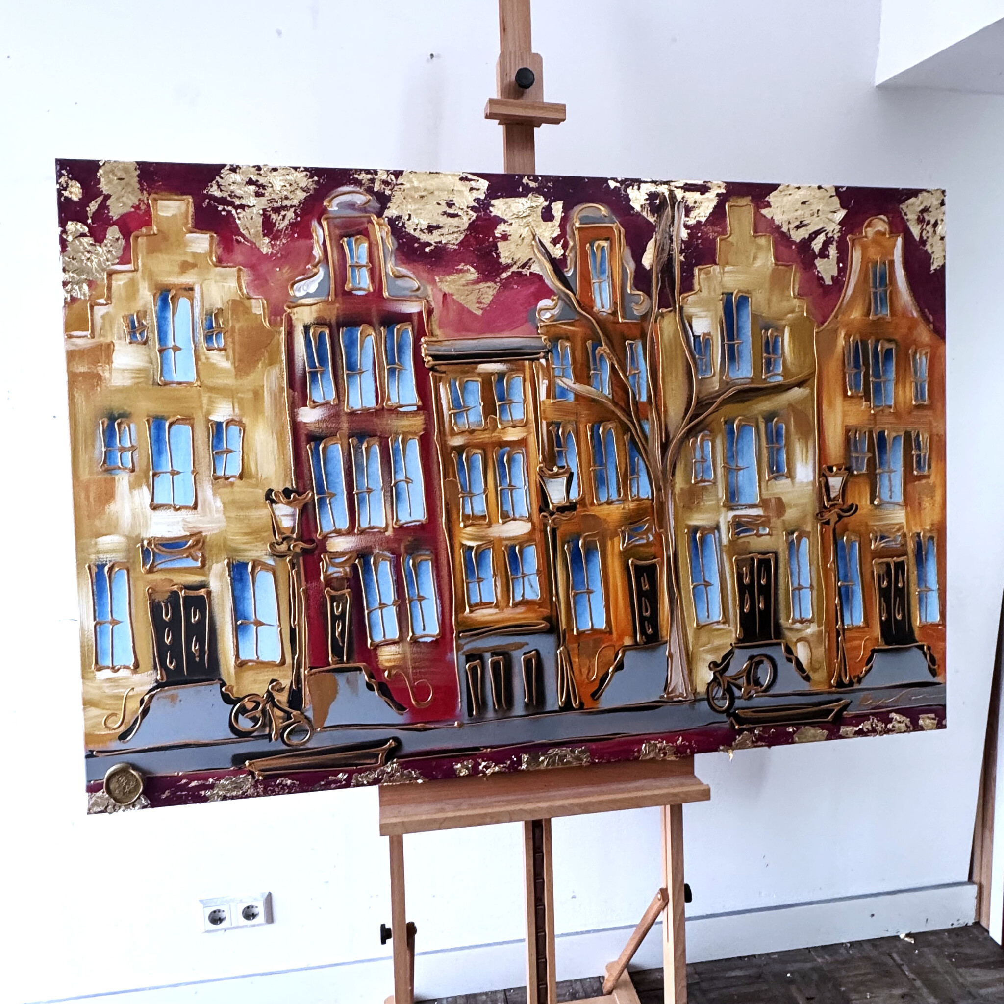 Artist Note: Mijn werken in de Amsterdam serie, zijn gemaakt in diverse lagen acryl verf, geïnspireerd op de glacis techniek van Rembrandt. Ook zo zichtbaar is de frottis techniek van de droge kwast in combinatie met in Parijs gekocht oliepastels van Sennelier (bekend van Picasso). Ook is de vrije tekenstijl, die ik opzet met houtskool, zeer kenmerkend. Elke laag van het werk ligt bloot door deze gemengde technieken.