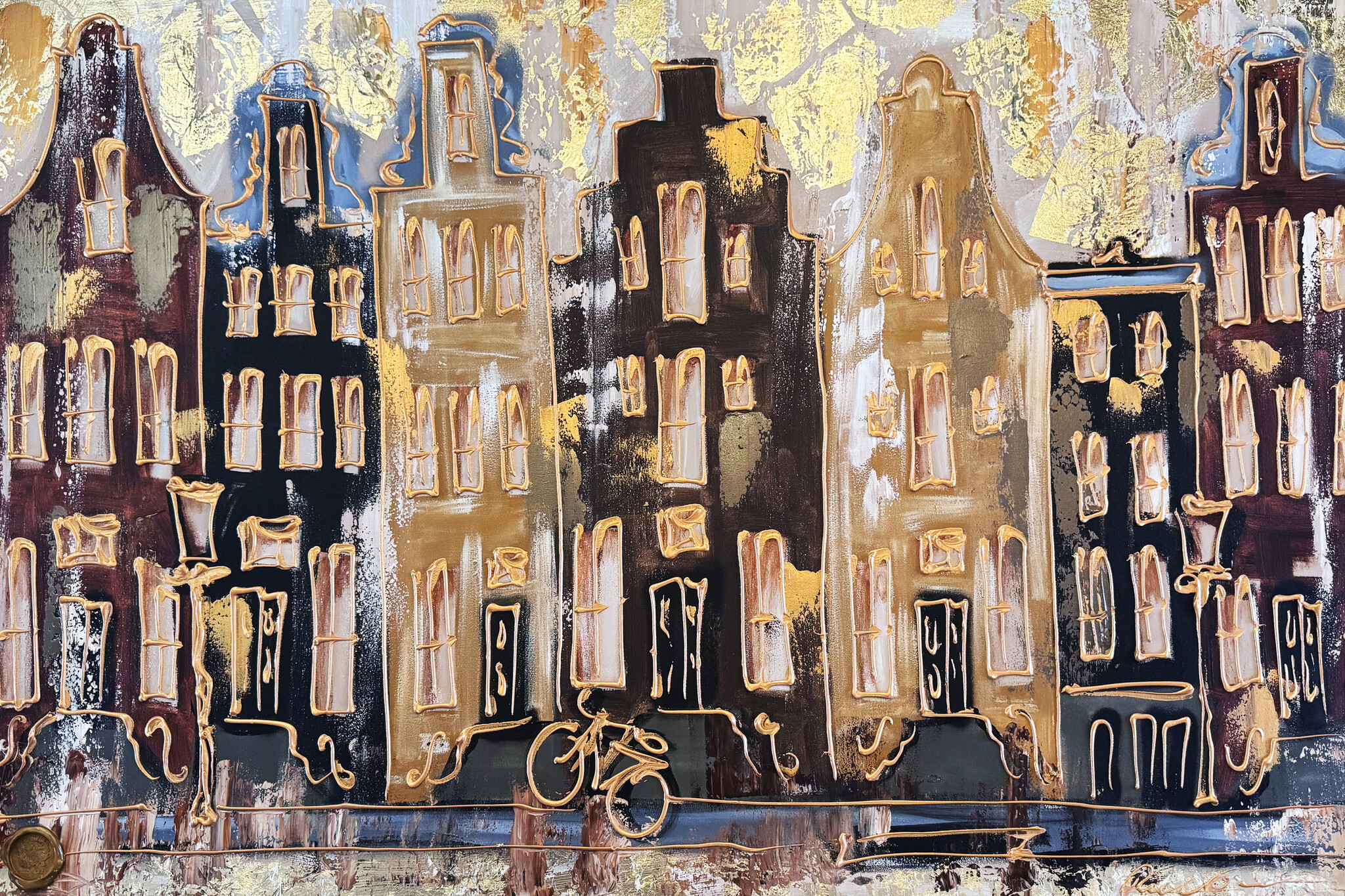 Artist Note: Mijn werken in de Amsterdam serie, zijn gemaakt in diverse lagen acryl verf, geïnspireerd op de glacis techniek van Rembrandt. Ook zo zichtbaar is de frottis techniek van de droge kwast in combinatie met in Parijs gekocht oliepastels van Sennelier (bekend van Picasso). Ook is de vrije tekenstijl, die ik opzet met houtskool, zeer kenmerkend. Elke laag van het werk ligt bloot door deze gemengde technieken.