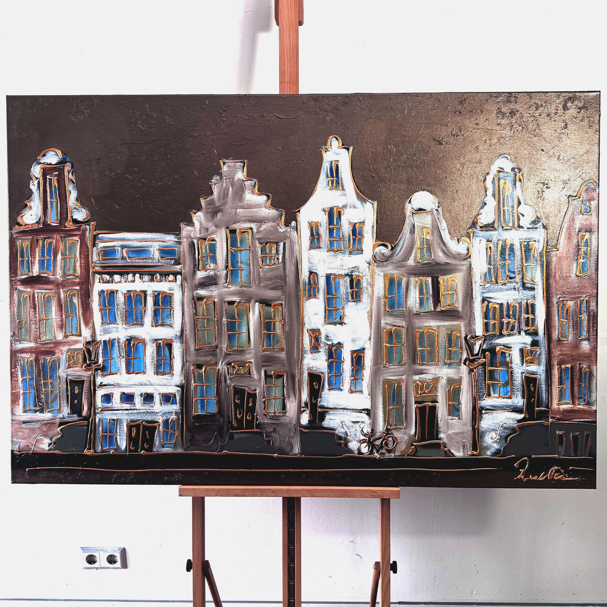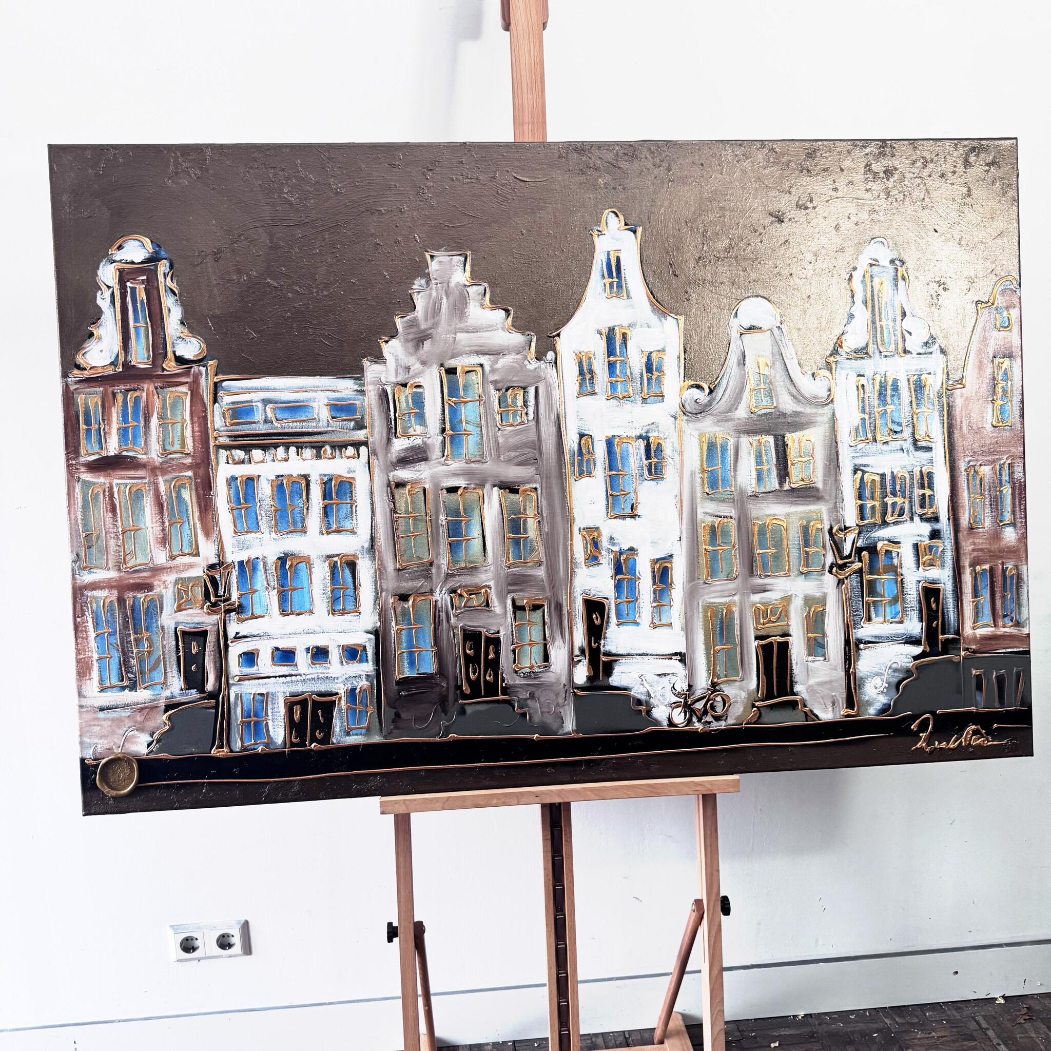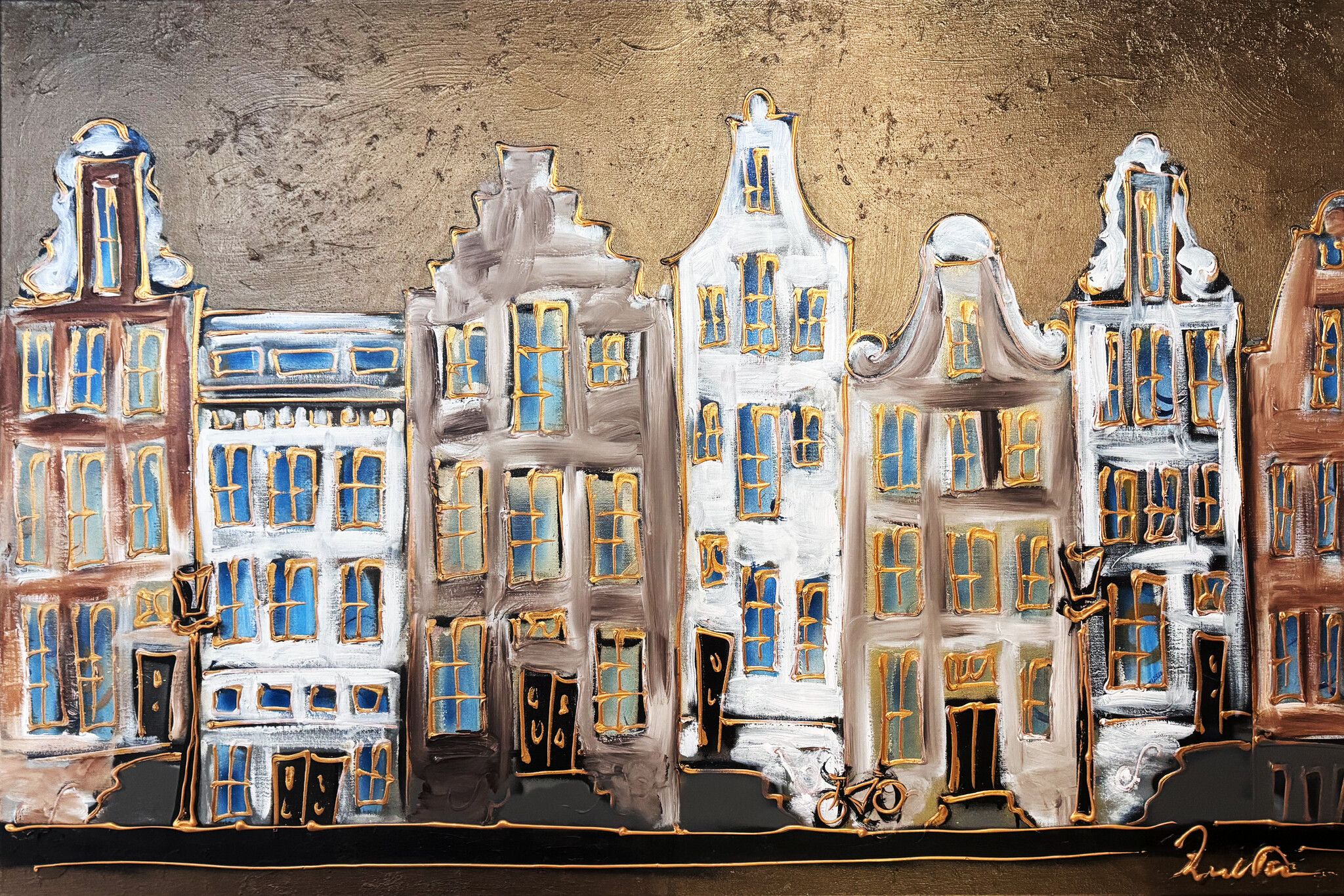 Schilderij- 80x120x4,5 cm - Amsterdam LUXURY style - grachten gevels in omber & Gold #232