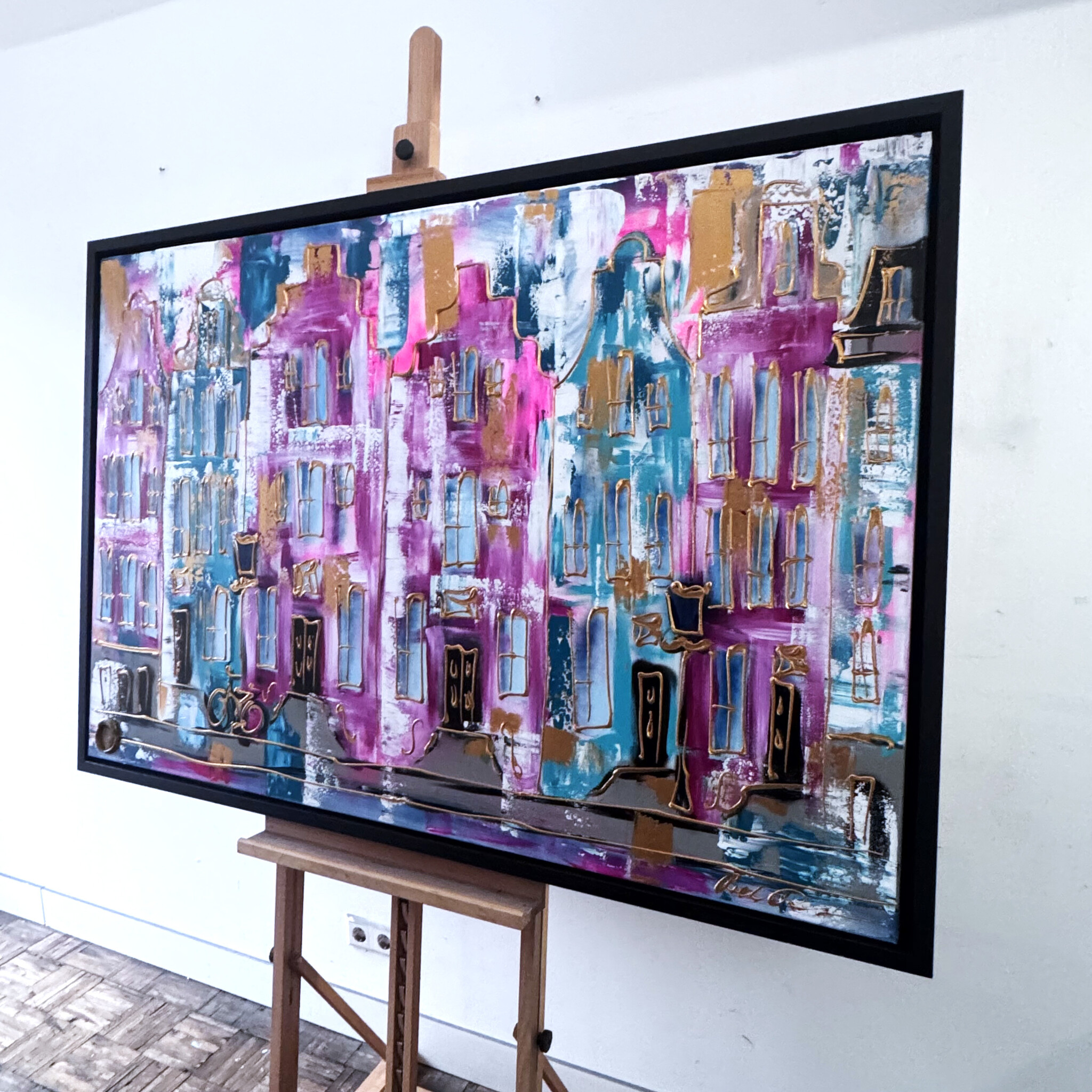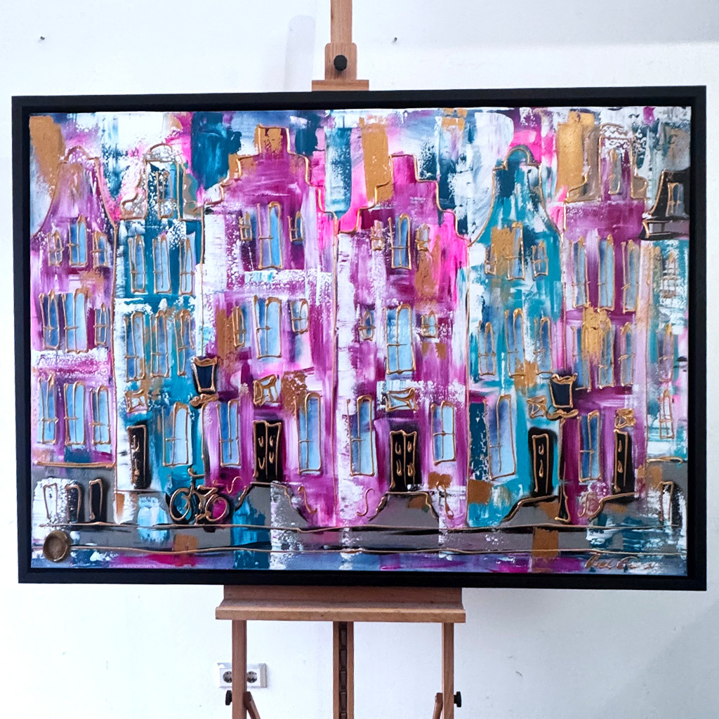 • Schilderij- 100x150x4,5 cm - Rick Triest - Amsterdam Canalhouses - Gold - BOHO CHIC - Pink & Gold
