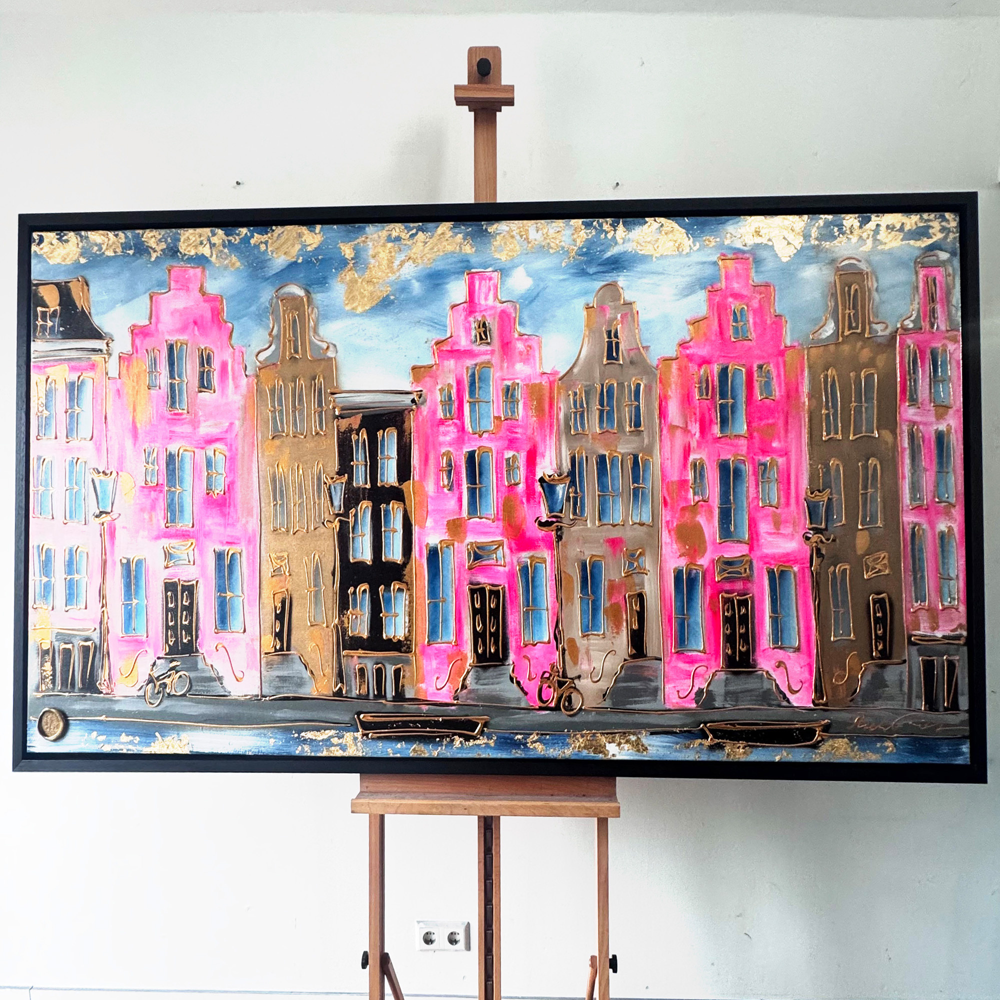Artist Note: Mijn werken in de Amsterdam serie, zijn gemaakt in diverse lagen acryl verf, geïnspireerd op de glacis techniek van Rembrandt. Ook zo zichtbaar is de frottis techniek van de droge kwast in combinatie met in Parijs gekocht oliepastels van Sennelier (bekend van Picasso). Ook is de vrije tekenstijl, die ik opzet met houtskool, zeer kenmerkend. Elke laag van het werk ligt bloot door deze gemengde technieken.
