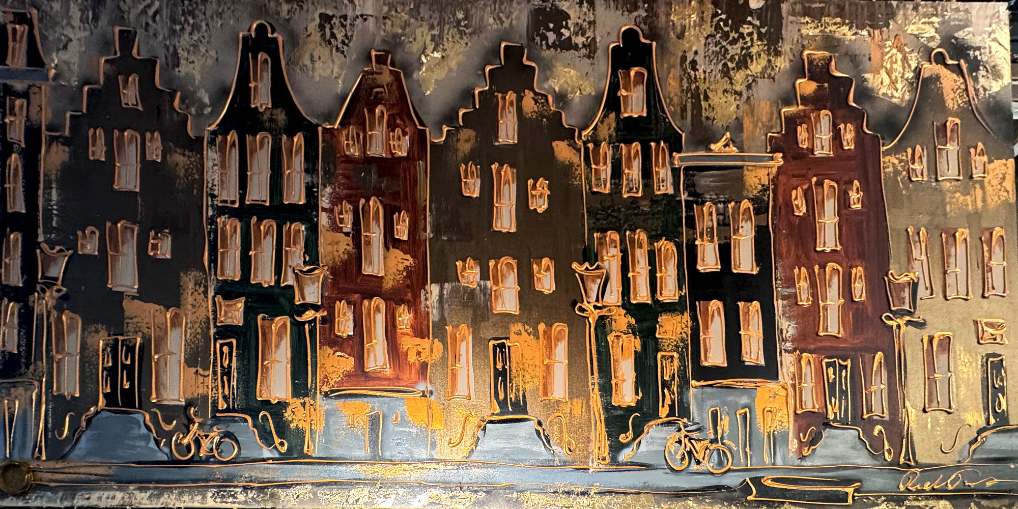 Rick bouwt zijn Amsterdam schilderijen op uit dikke lagen verf en werkt met een duidelijk handschrift wat zijn signatuur vormt. De dikke gouden lijn tekening waarmee zijn werk wordt afgemaakt doet de kijker al snel denken aan Amsterdam in de gouden eeuw.